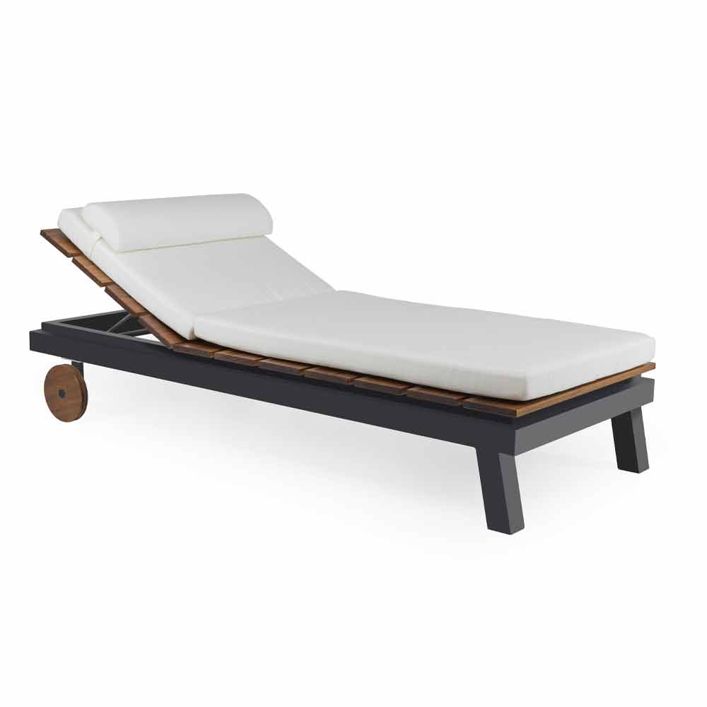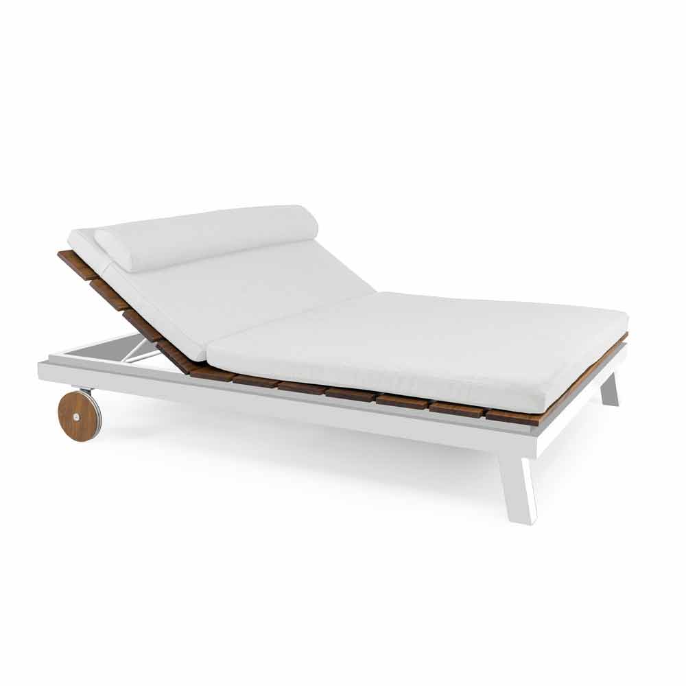 Jedno nebo dvojité zahradní lehátko z bílého nebo černého hliníku, dřevěné lamely a kolečka a polštáře.