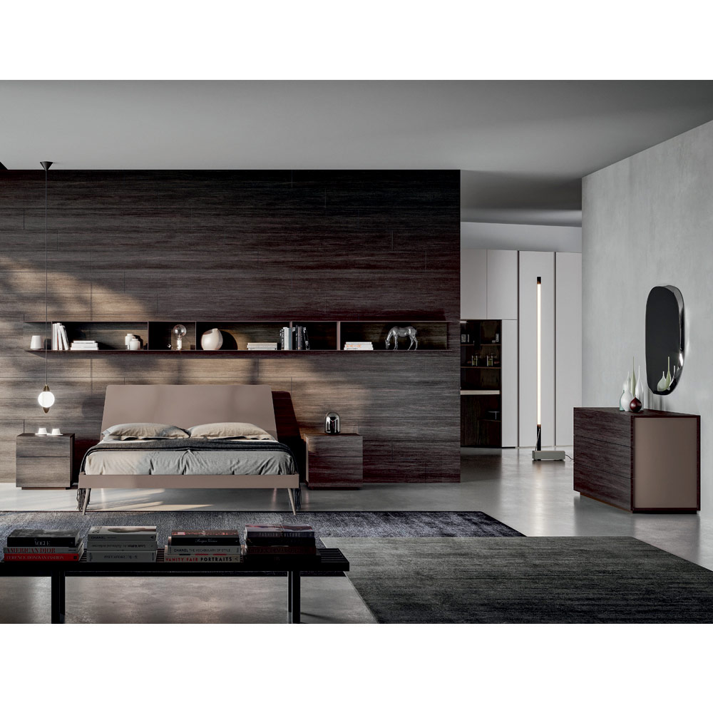 Tuto skladbu nábytku pro spací část charakterizuje střízlivý a vytříbený styl , ideální pro ty, kteří hledají design, který může exkluzivně a s osobností obohatit a revolucionizovat estetiku místnosti. Postel, nesporný protagonista prostředí, se jeví jako živá skvrna zasazená do jednoduchého a zároveň jedinečného kontextu, ve kterém povrchové úpravy hrají v