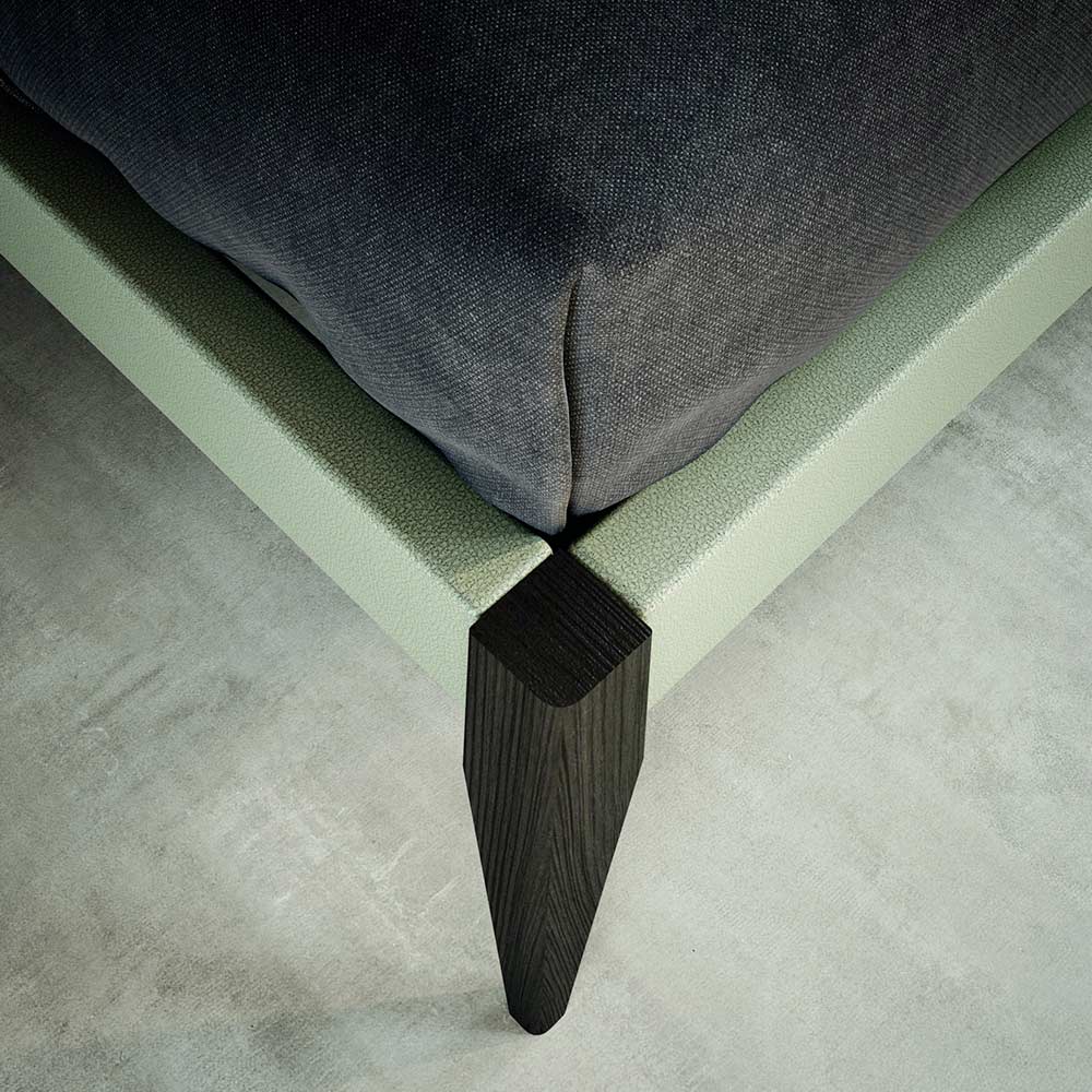 vizuální rovnováhu mezi bohatými objemy čela postele, obohacenými konkrétním centrálním prošíváním, a střízlivými a zásadními liniemi rámu postele. Prvky, které jej obklopují, jsou s ním kombinovány a vytvářejí