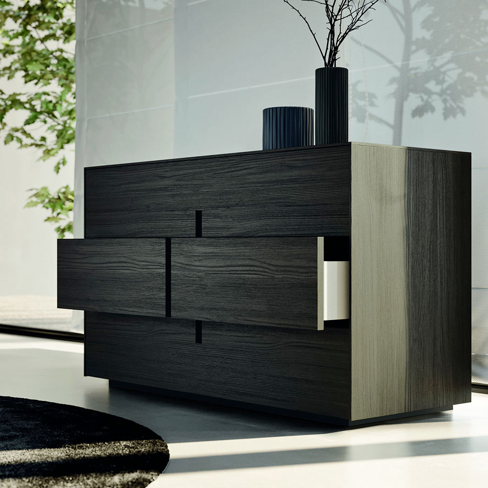 dřevěnými nohami s povrchovou úpravou z dřevěného uhlí, noční stolek se 2 zásuvkami, komodu se 3 zásuvkami a 2 vysoké zásuvky se 6 zásuvkami na