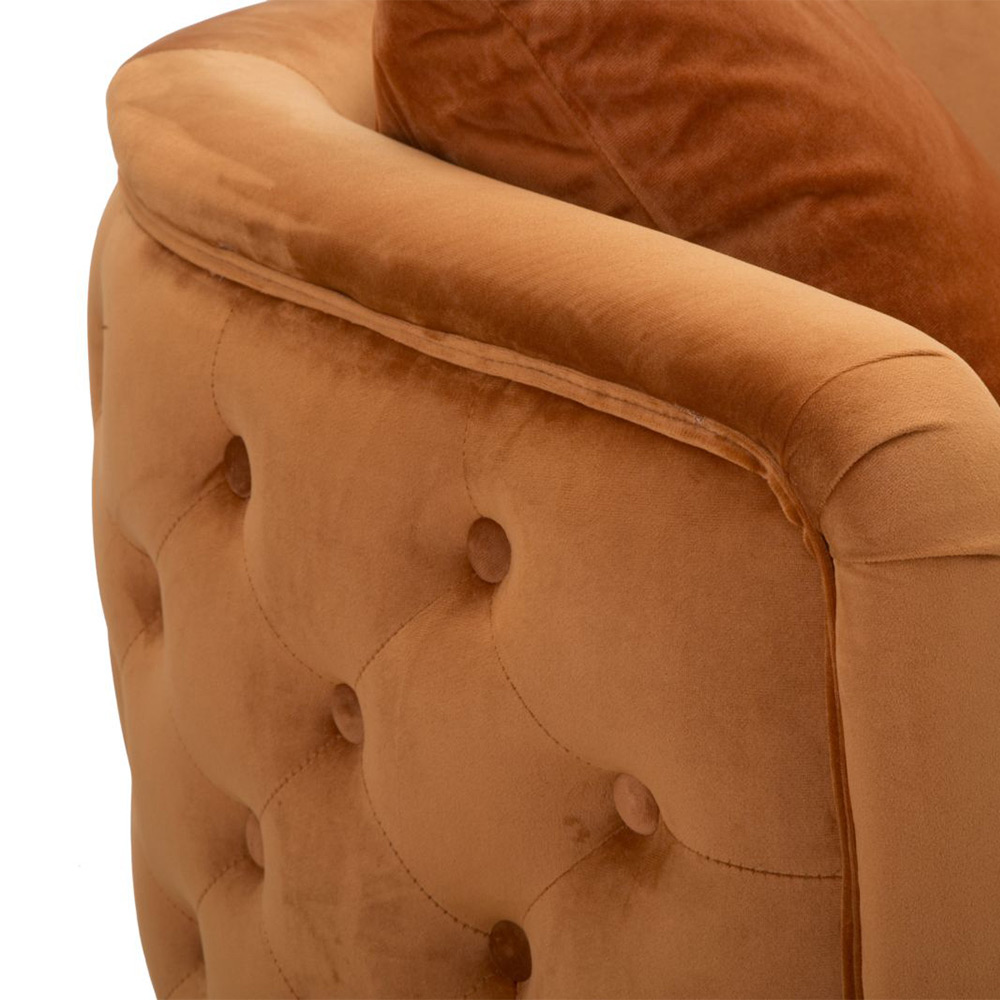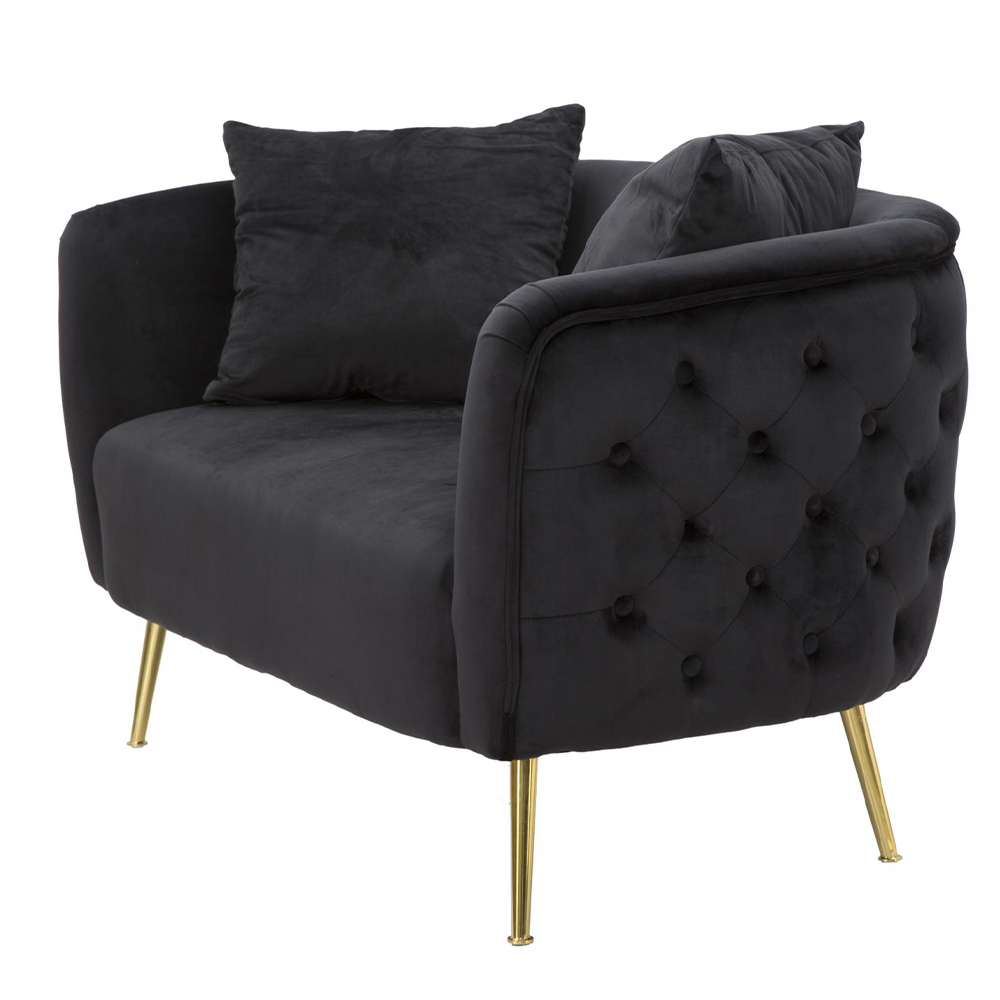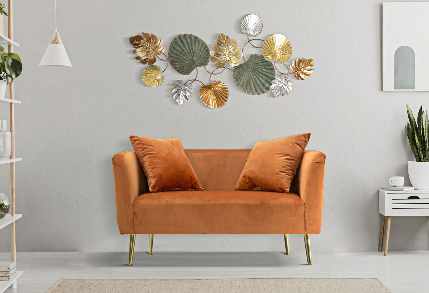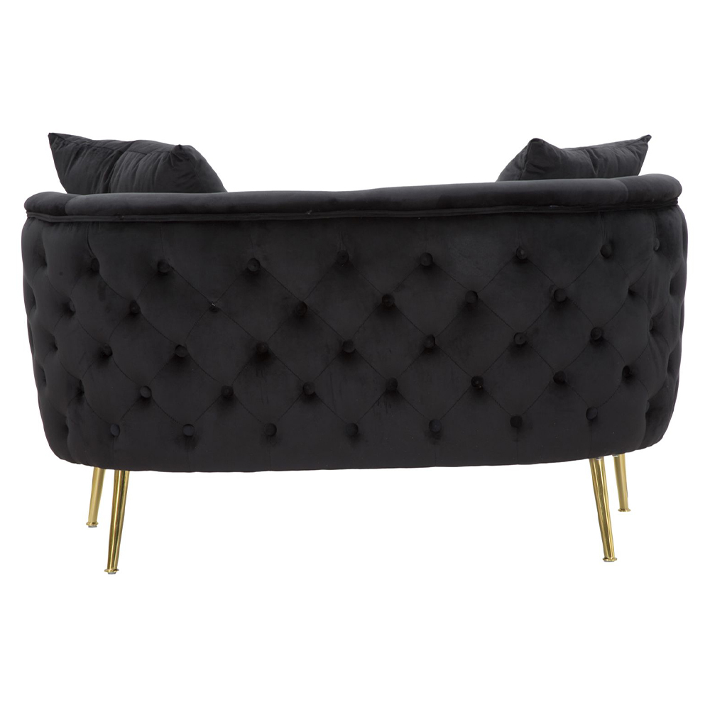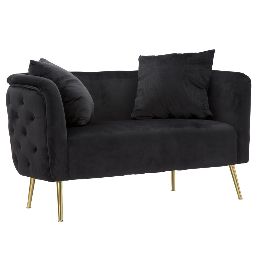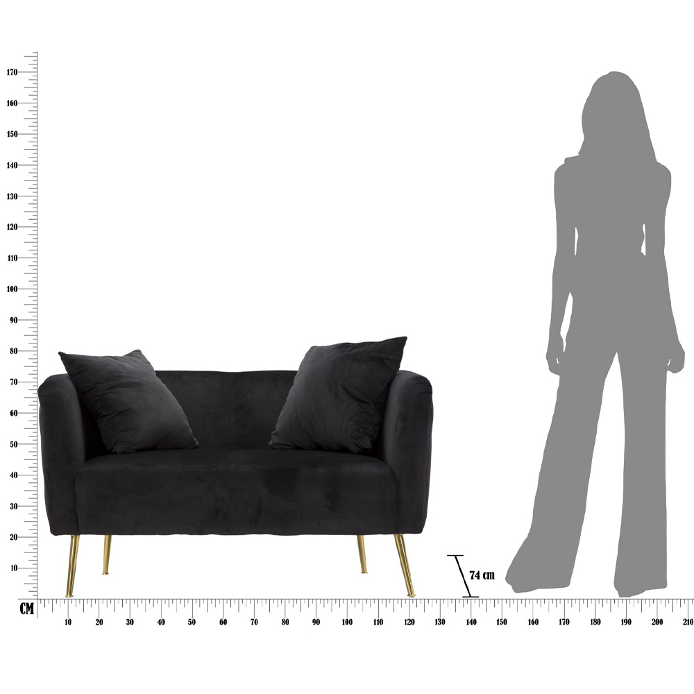 Moderní dvoumístná pohovka ze dřeva, železa a sametu.