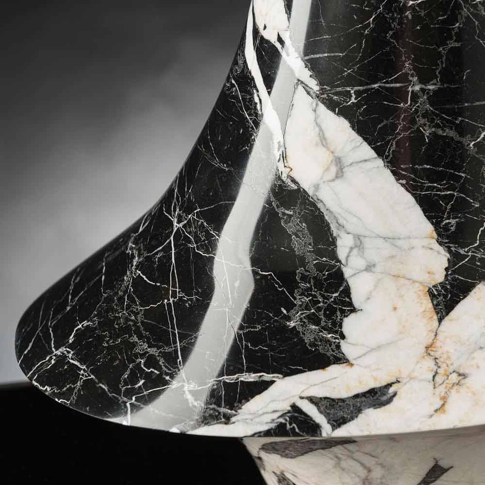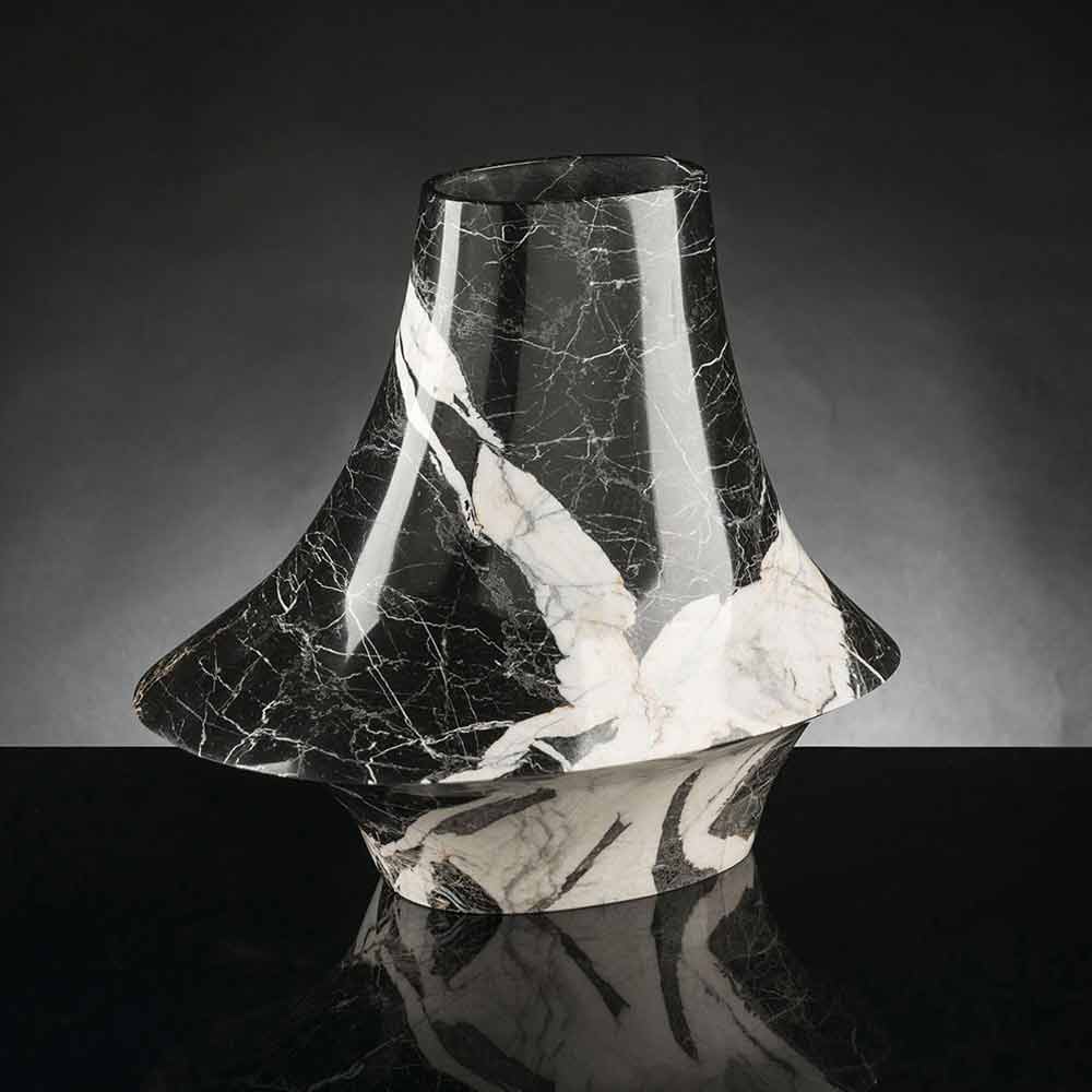 Vnitřní okrasná váza z černého mramoru s bílými žilkami prostřednictvím 100% výroby v Itálii . Jeho výroba probíhá zpracováním přírodních kamenů pomocí 5osých pantografů, které umožňují získat složitější tvary než jednoduché objemy rotace. Tento elegantní kus nábytku pochází ze spojení mezi studiem přírodních jevů a interakcí materiálů použitých s lidskou technologií k oživení jedinečného a avantgardního stylu nábytku. Výsledkem je exkluzivní dekorativní prvek schopný obohatit každé prostředí o moderní a vytříbenou estetiku s osobností. Ideální styl pro nejrůznější prostředí, od bytového vybavení po hotely, restaurace, smluvní prostory, lázně, ale také jako prostředí pro akce a svatby.