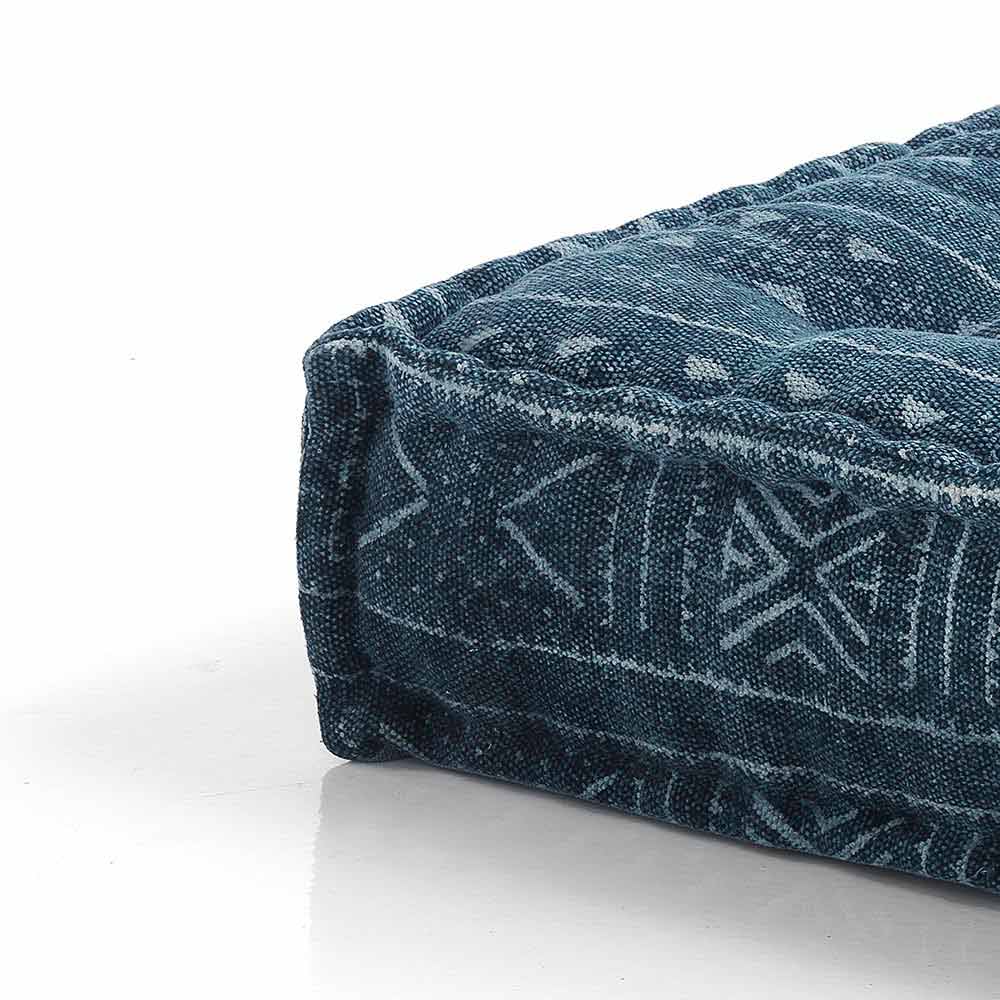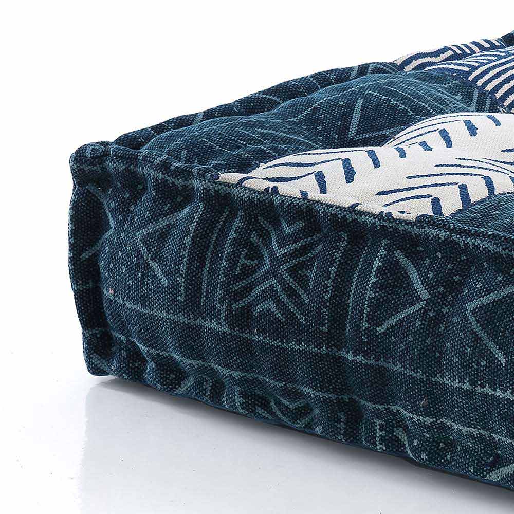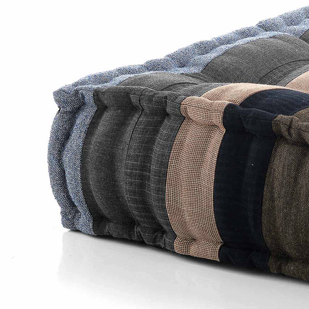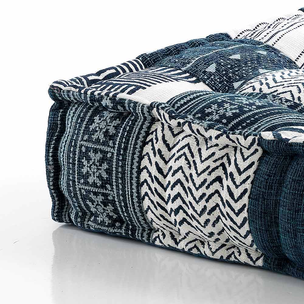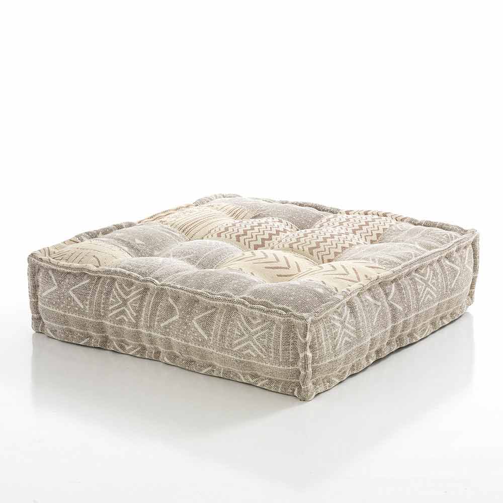 Pouf v patchworkové látce nebo čtvercovém sametu s etnickým designem.