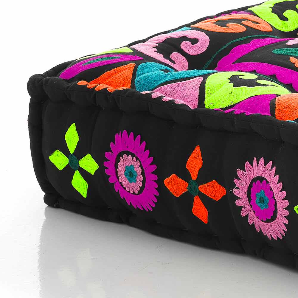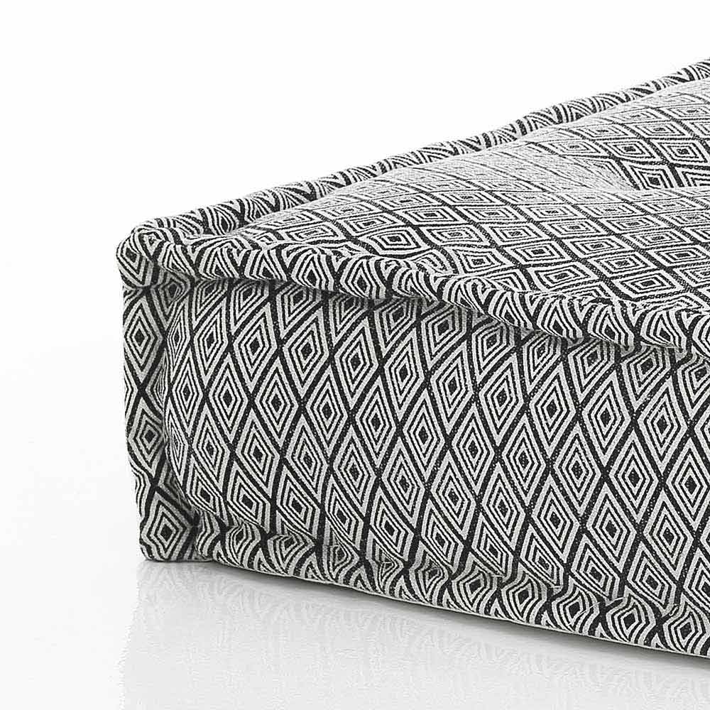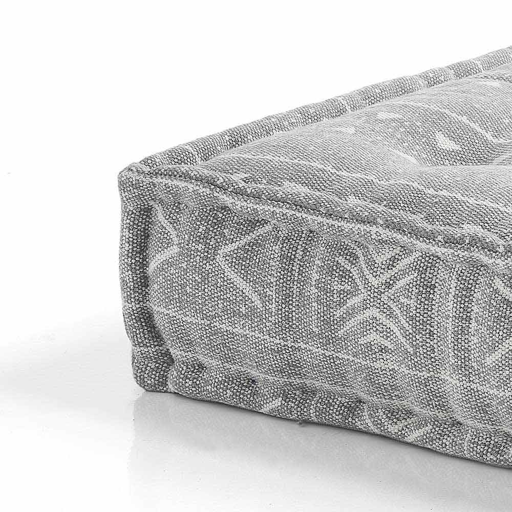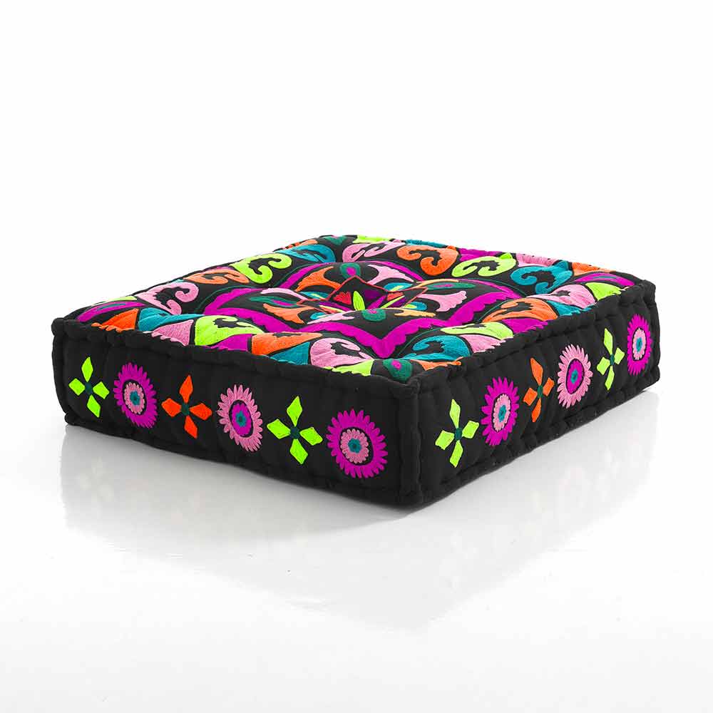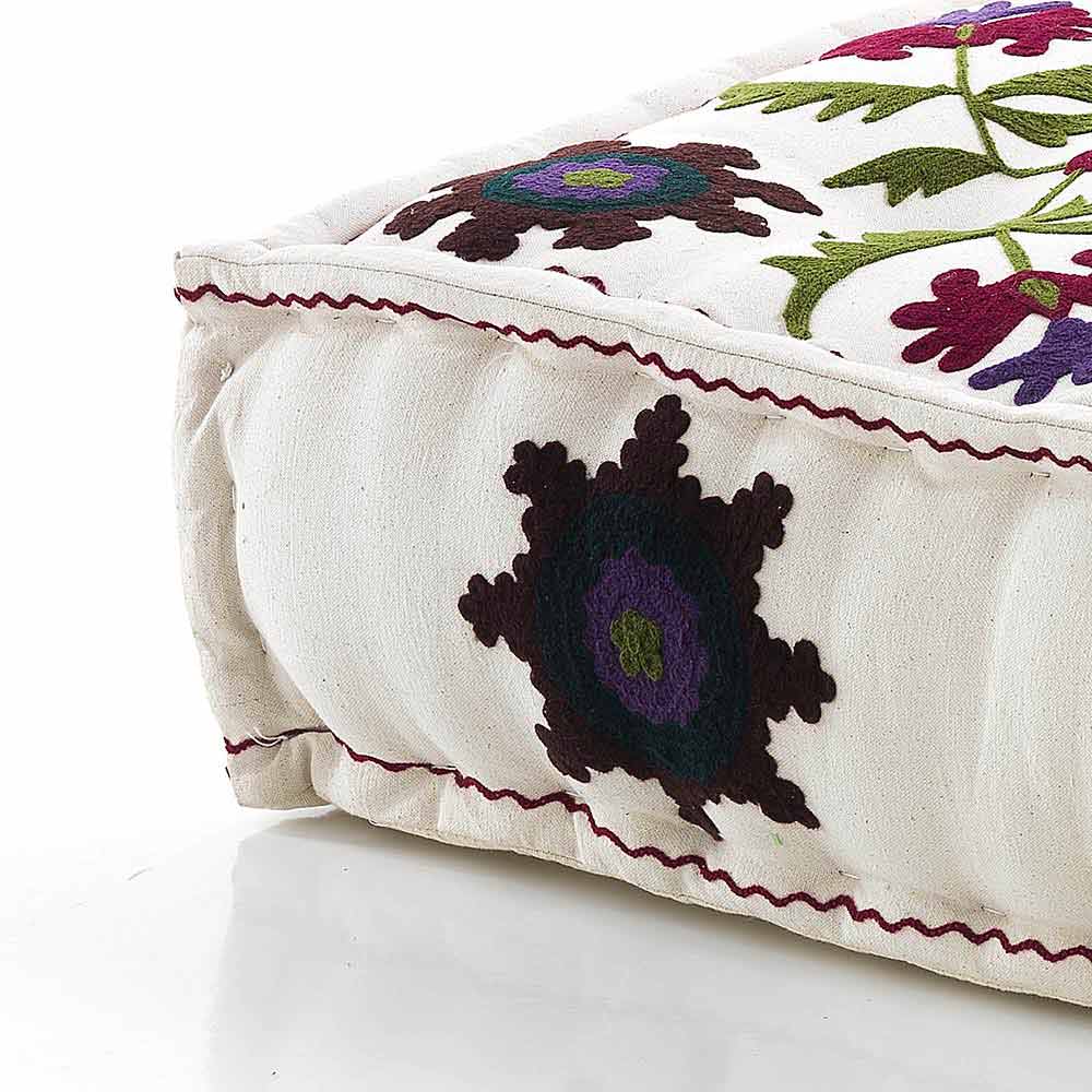 Pouf v patchworkové látce nebo čtvercovém sametu s etnickým designem.