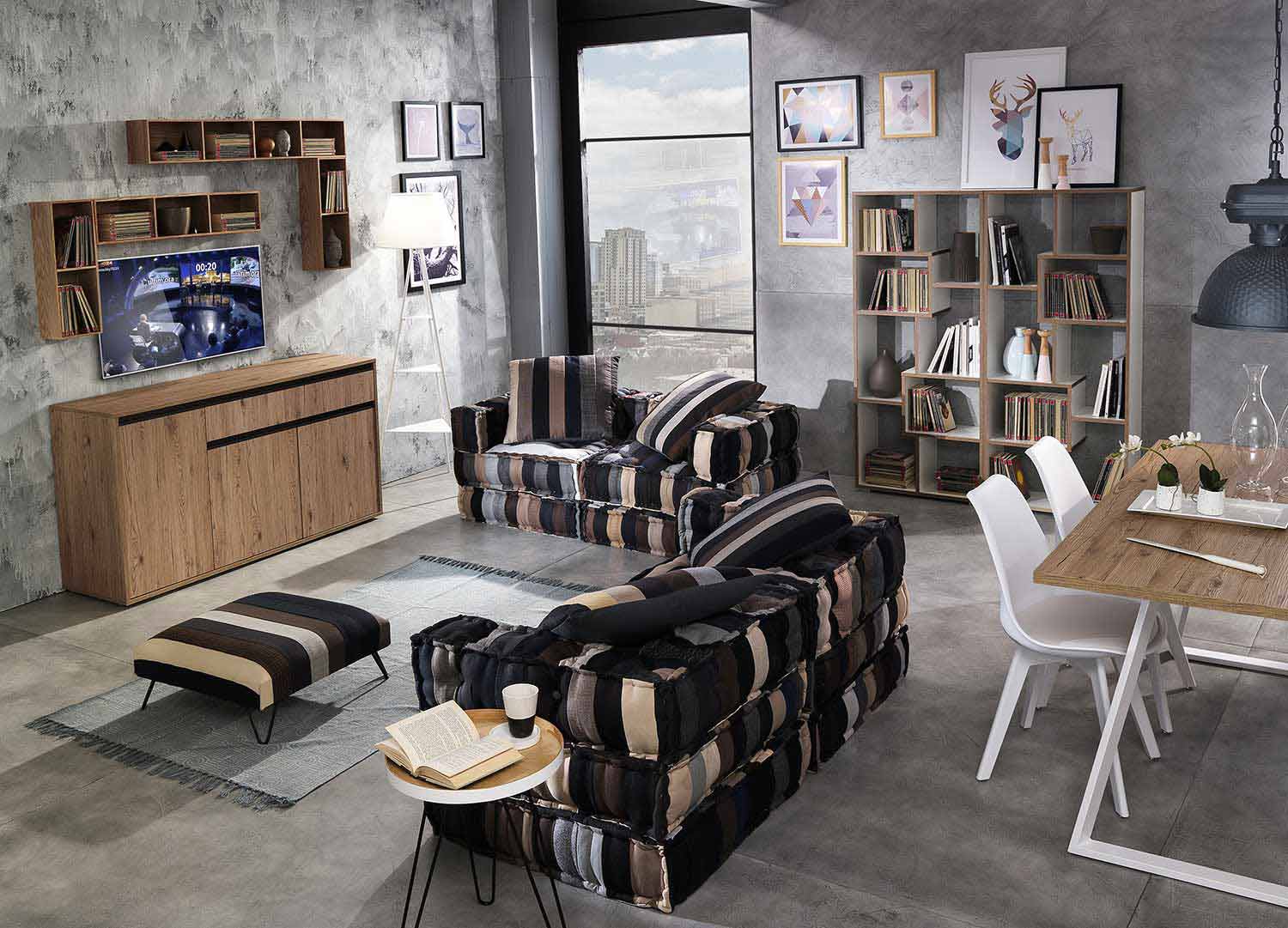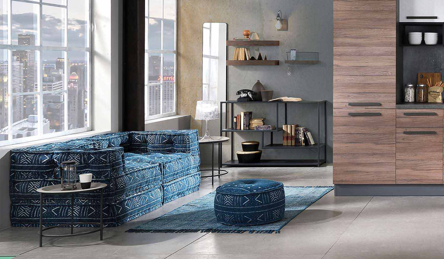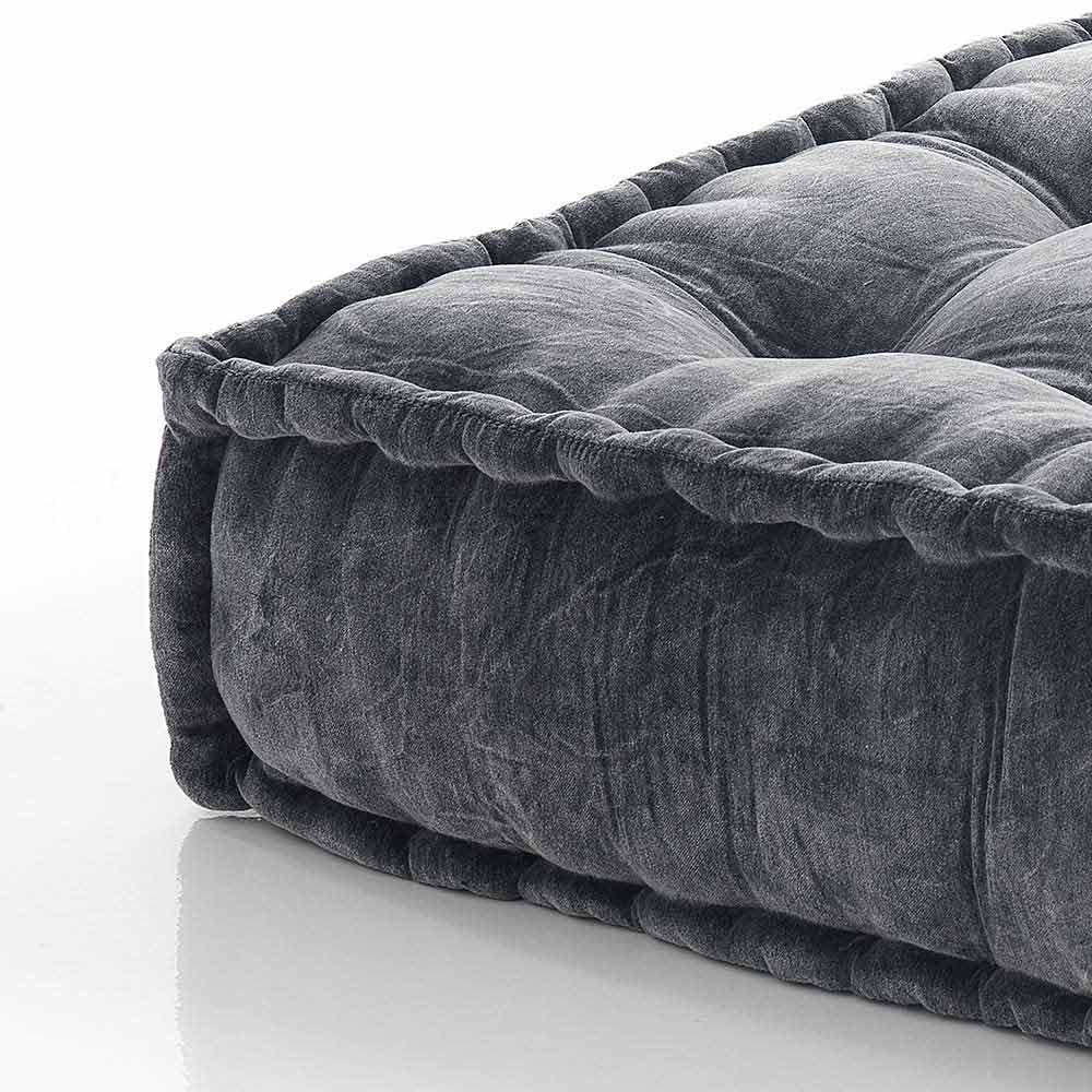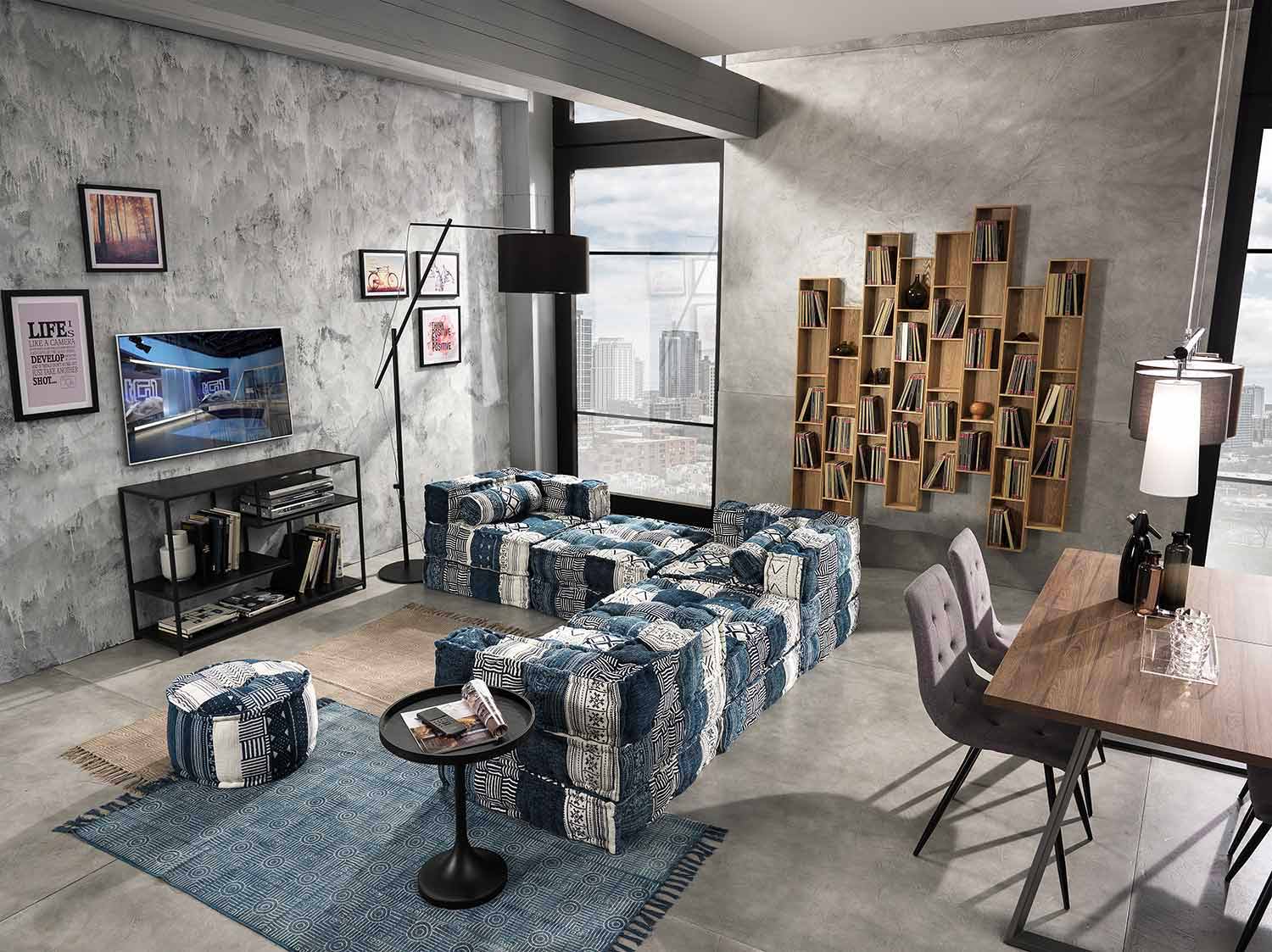 Pouf v patchworkové látce nebo čtvercovém sametu s etnickým designem.