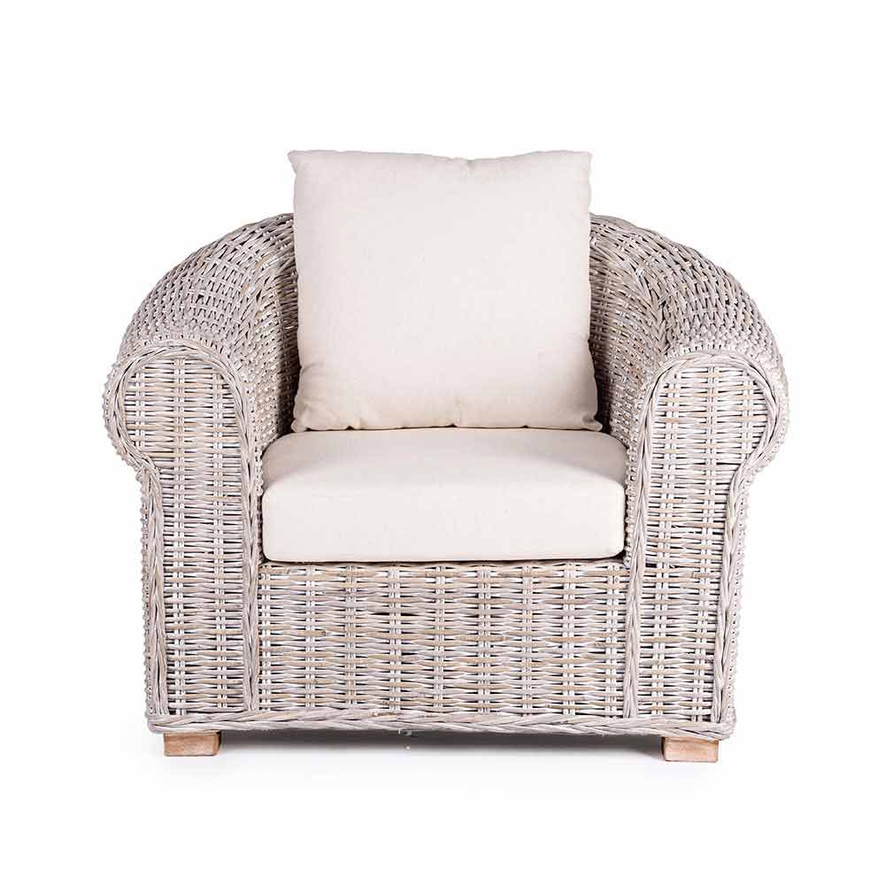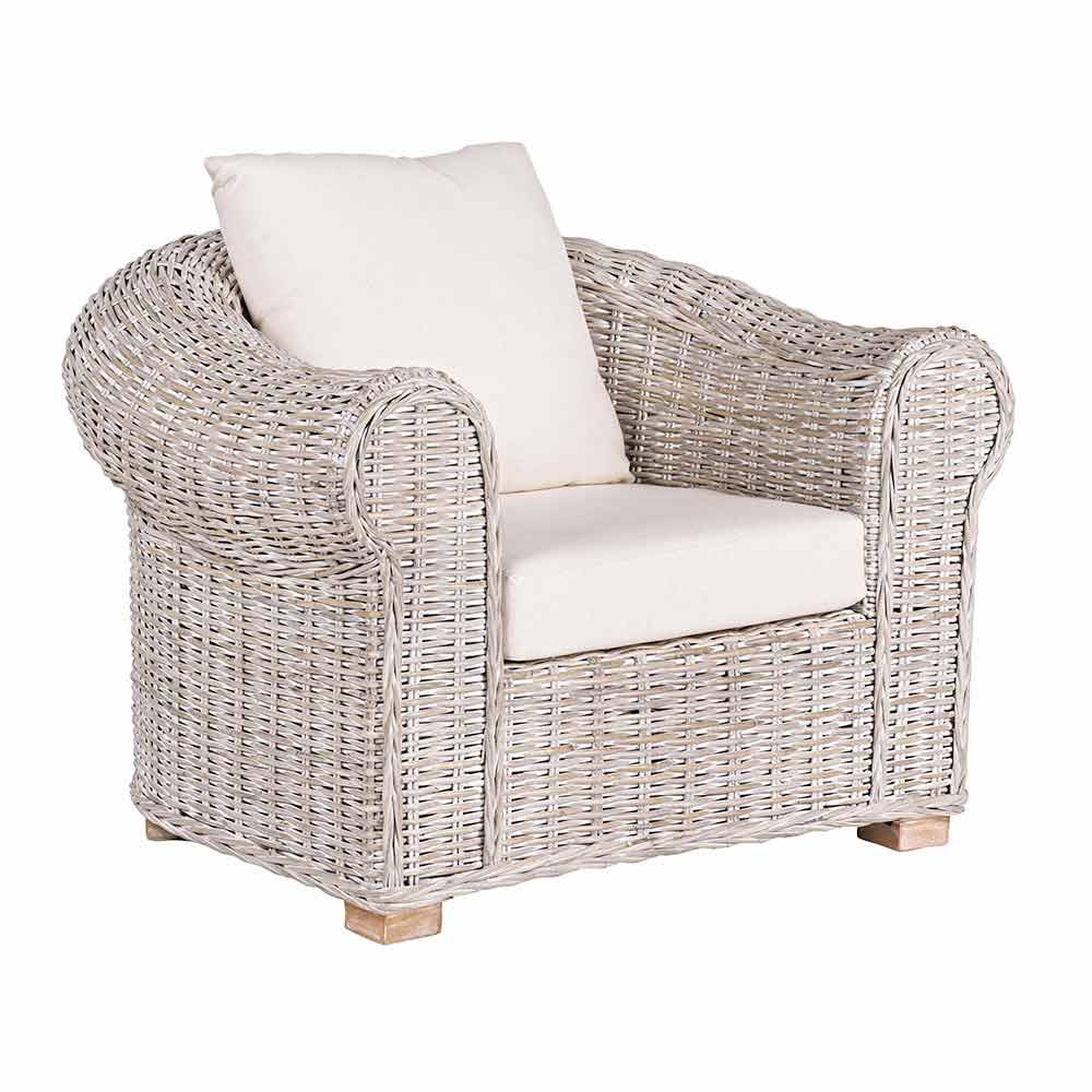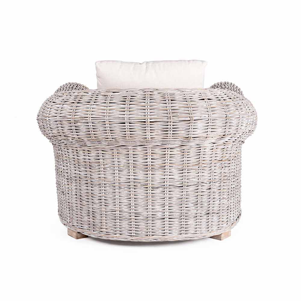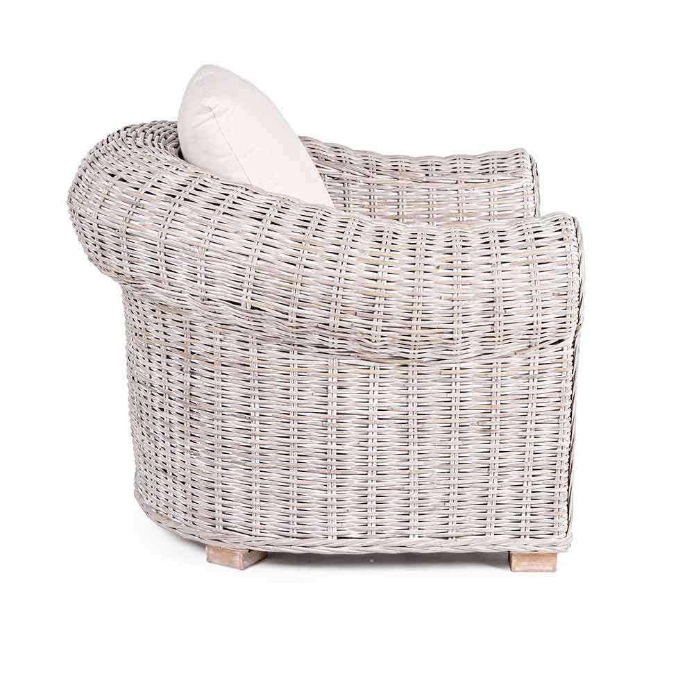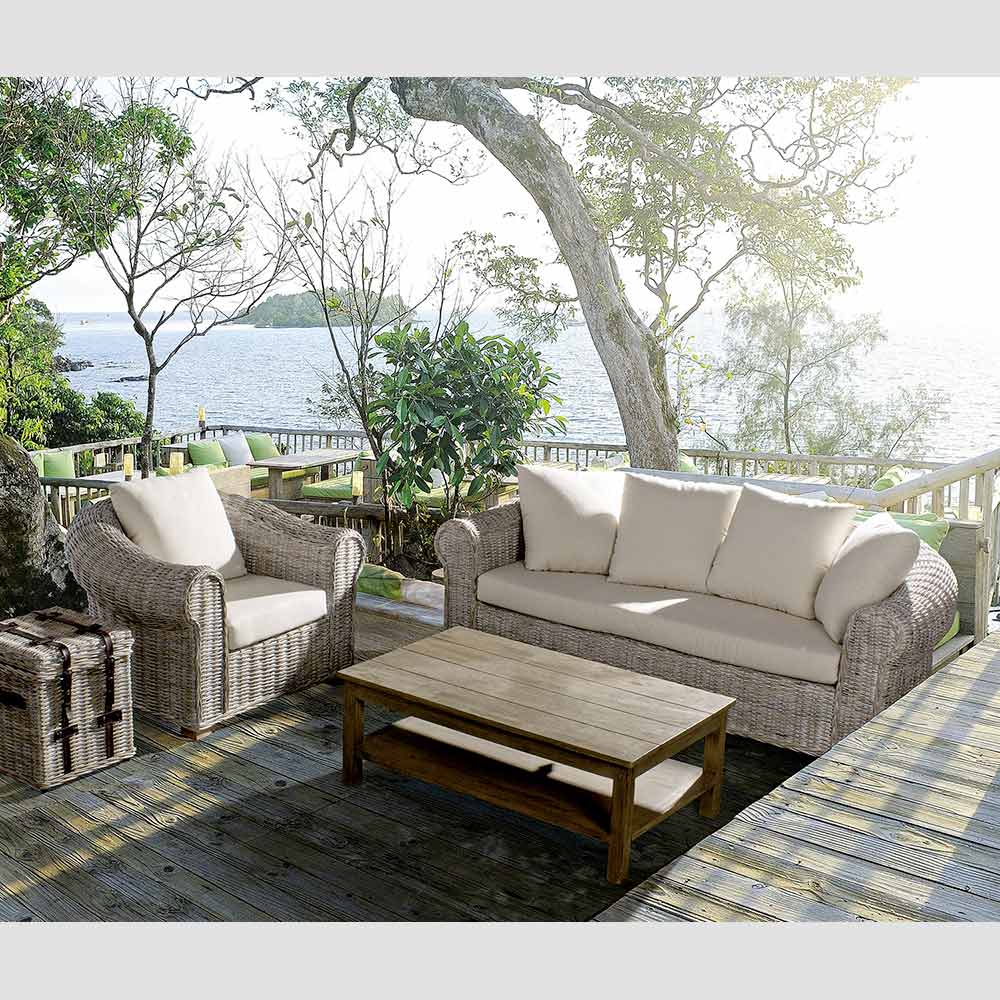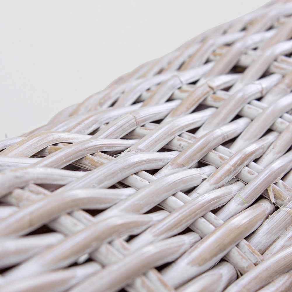 Ratanová struktura, vazba kubu, povrchová úprava na bázi nitrocelulózy. Mango dřevěné nohy. Polštáře s odnímatelným potahem pro vnitřní použití (prádlo).