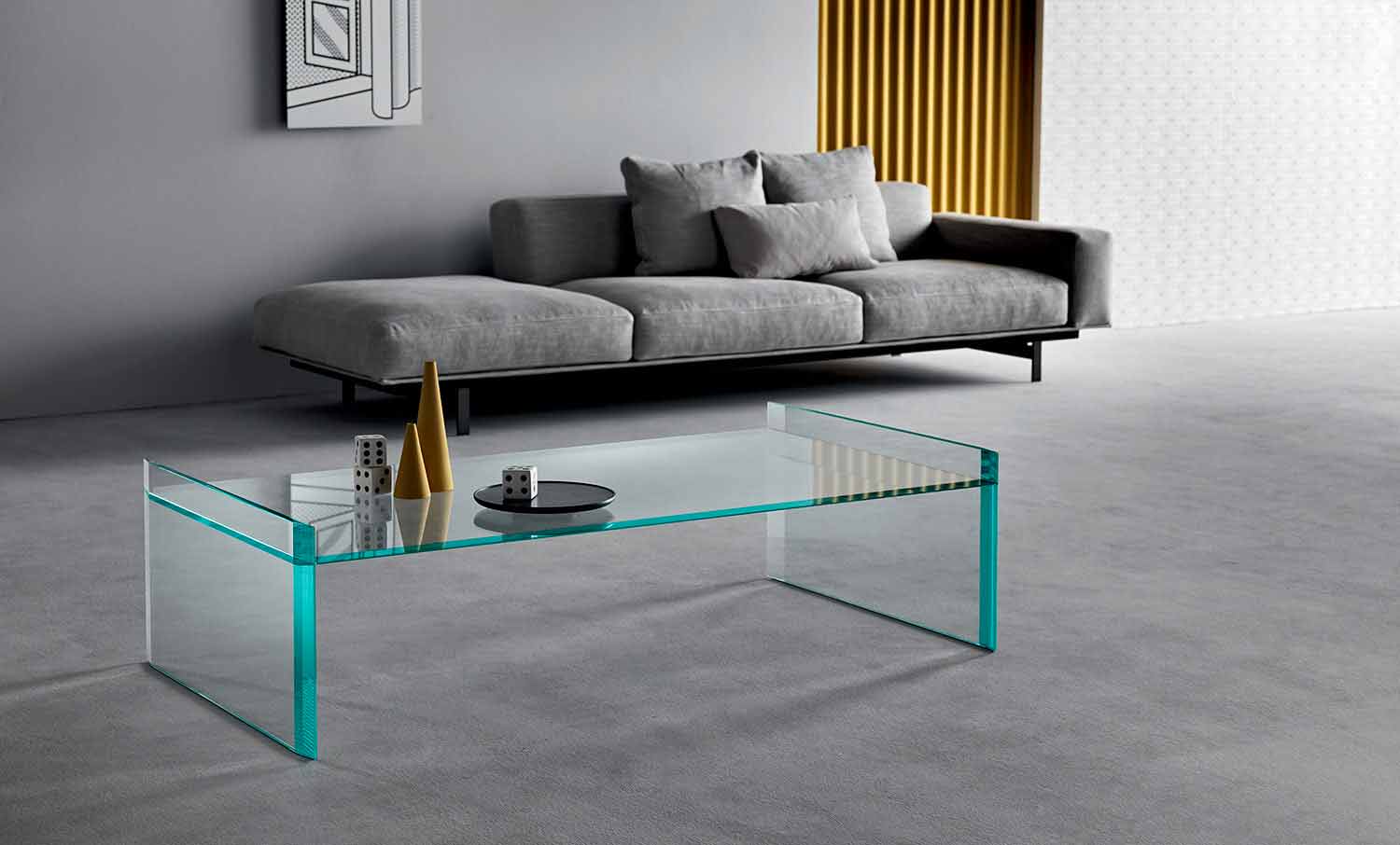 Konferenční stolek moderního designu v extra čirém skle se zkosenými hranami, ručně vyráběný v Itálii.