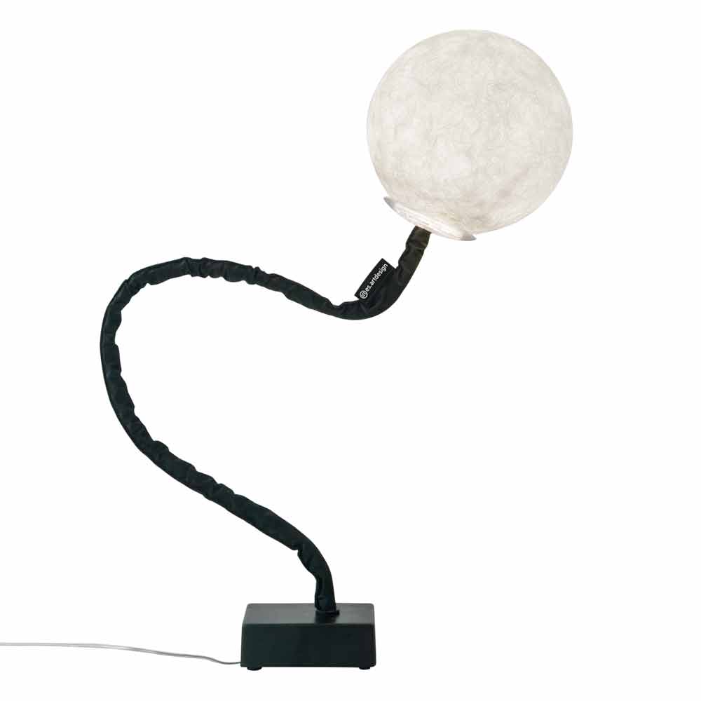 Struktura moderní stojací lampy Micro Luna je flexibilní a nastavitelná a je vyrobena z litiny a oceli, zatímco světelná koule je vyrobena z Nebulite® , inovativního materiálu složeného z pryskyřice a vlákna, jehož žíly dodávají lampě zvláštní efekt “ měsíční".