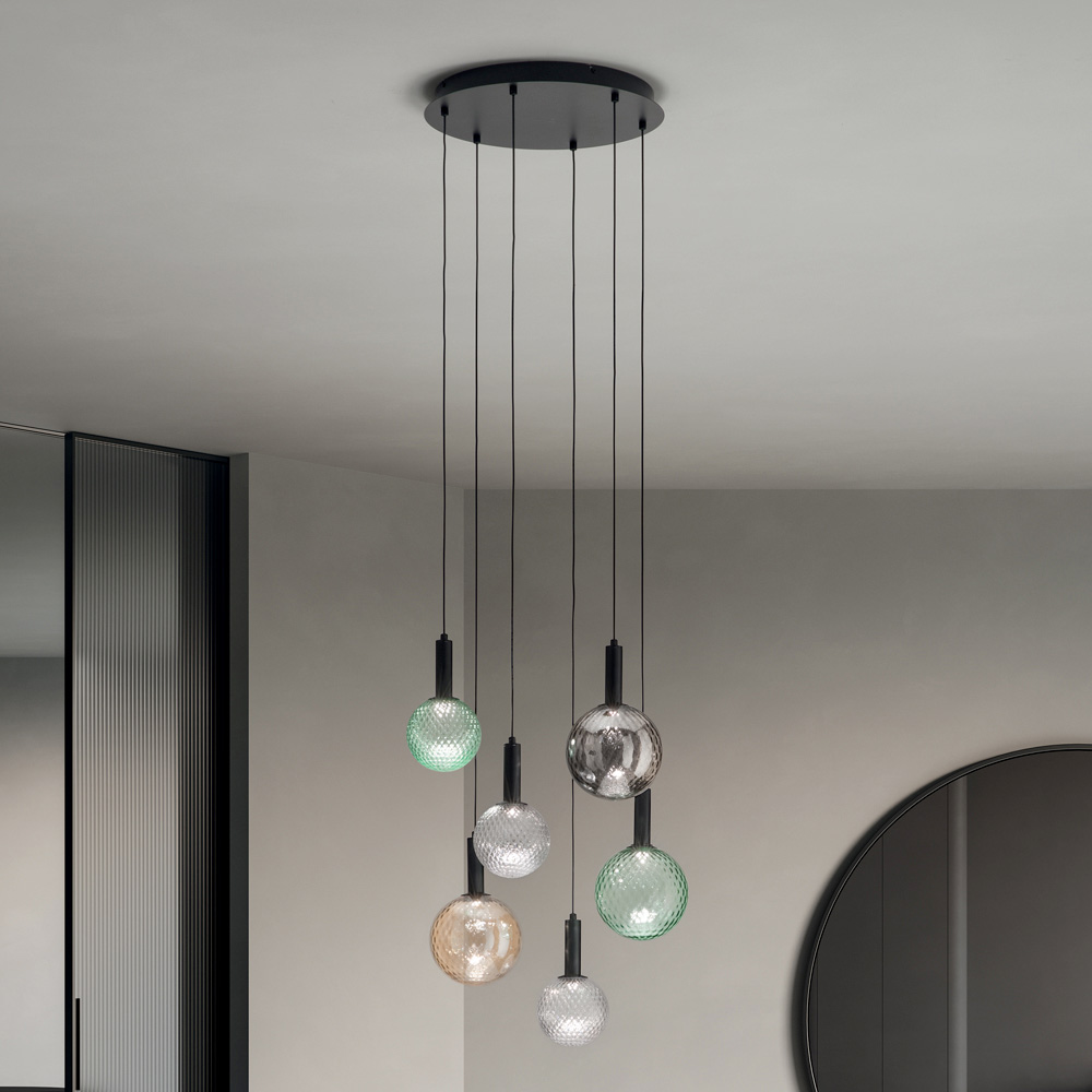 Ponořte se do zářivé elegance našeho vícezávěsného svítidla, skutečného sběratelského kousku pro ty, kteří ocení moderní design a funkčnost . Tento lustr se skleněnými koulemi s jedinečnými a rozmanitými texturami promítá hru světla, která obohatí každé prostředí teplým a příjemným světlem.