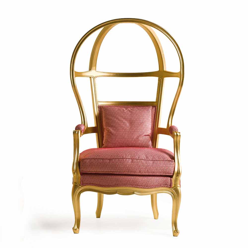 Babette je papežský křeslo s dřevěnou konstrukcí, polstrovaná a čalouněný BV Trendy Standford tkáně. Vysoká otevřená část. Skončit v matném plátkovým zlatem.
