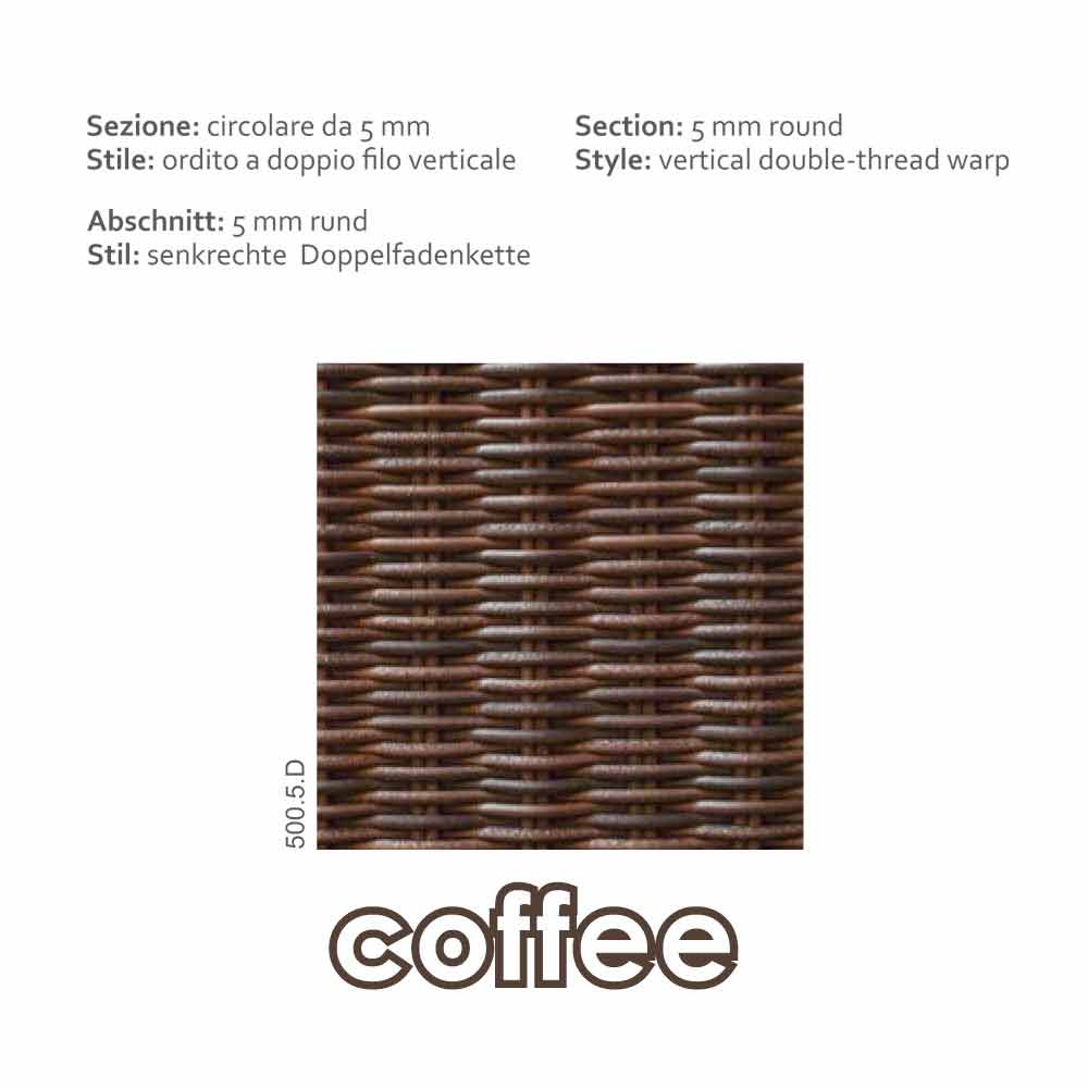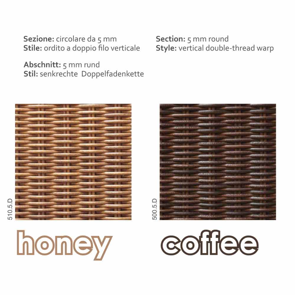 Jonny je tvořen hliníkovým rámem, polyethylenovou strukturou 5 mm kolo, pletené zcela ručně, který je k dispozici ve dvou různých odstínech: káva a med.