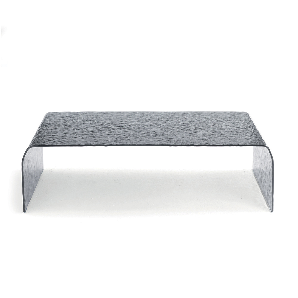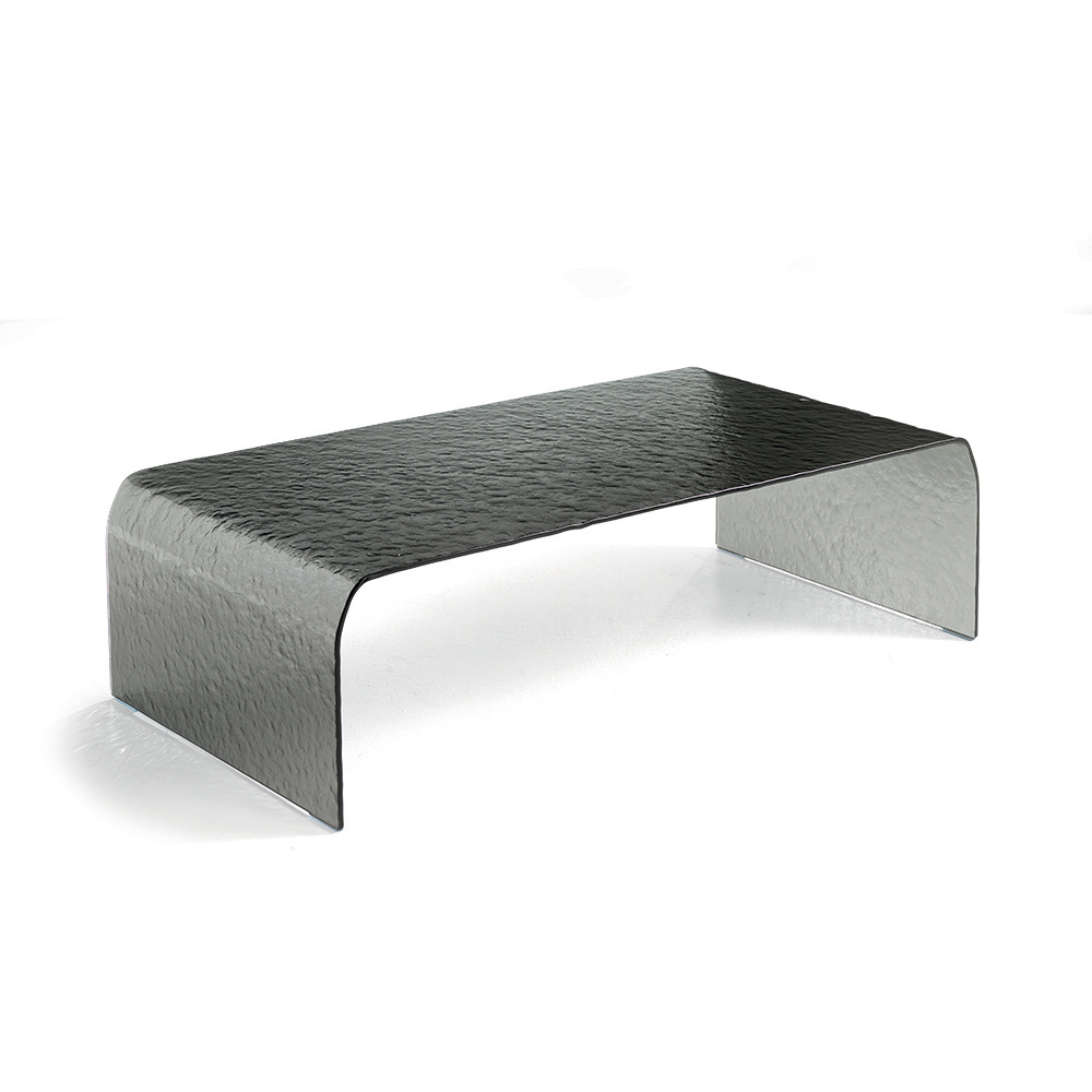 Tento konferenční stolek, vyrobený z jediné tabule zakřiveného čirého skla , se vyznačuje rafinovanou tepanou povrchovou úpravou , která vytváří jemnou souhru odrazů a hloubky. Bezešvý, souvislý tvar umocňuje čistotu materiálu a proměňuje stolek ve skutečně sochařský objekt.