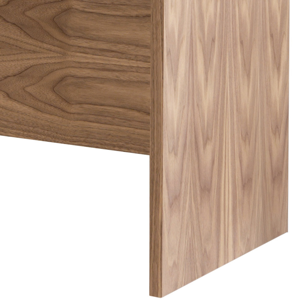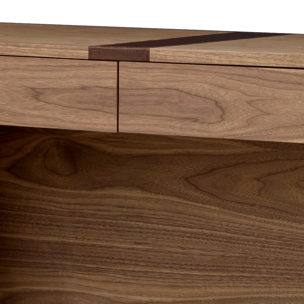 Vyrobeno z zakřivené překližky dýhované v ořechovém tvarohu s čelními vložkami z přírodní kůže.