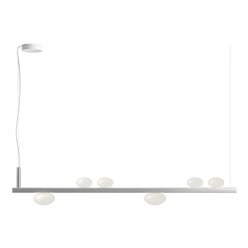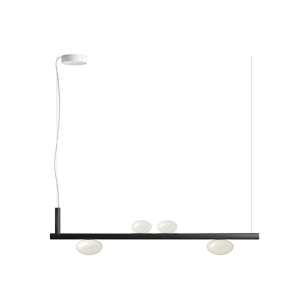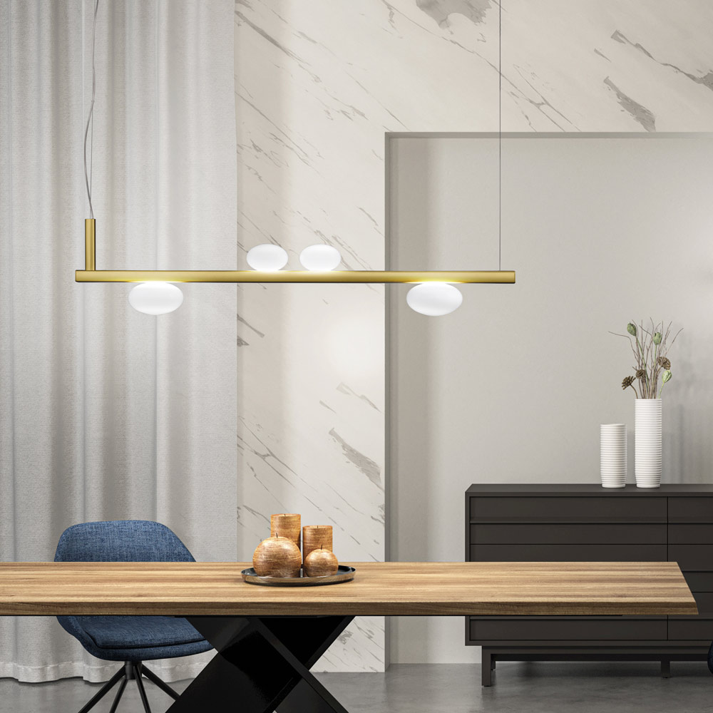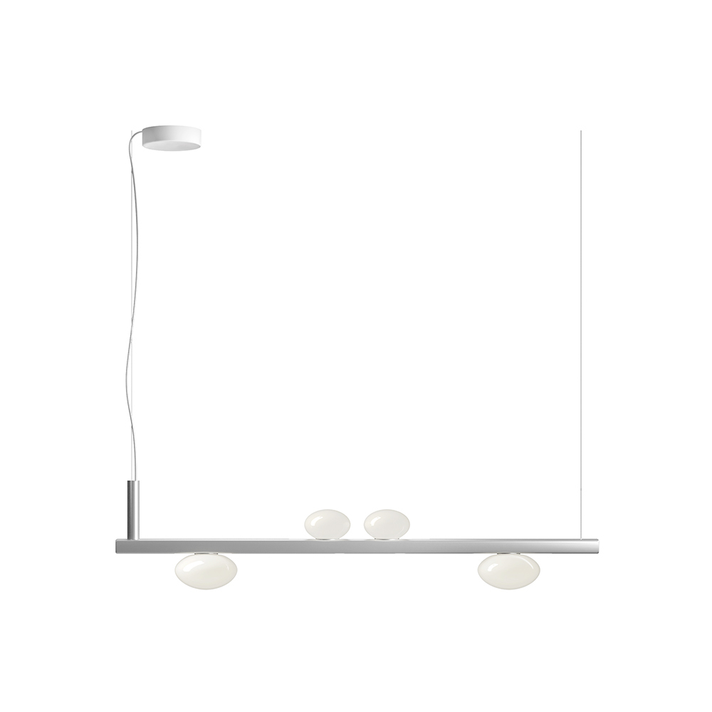 Tato závěsná lampa je skutečnou ikonou inteligentního designu a diskrétní technologie . Její čistá, lineární struktura je spárována s elegantními kulatými difuzory z opálového skla, které působí dojmem, že jsou zavěšeny v rovnováze, a vytvářejí tak moderní a lehký vizuální efekt.