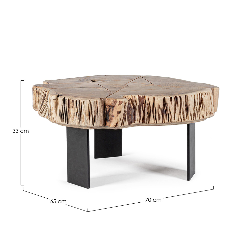 Nízký stolek do obývacího pokoje z oceli a kufru z přírodního akáciového dřeva.