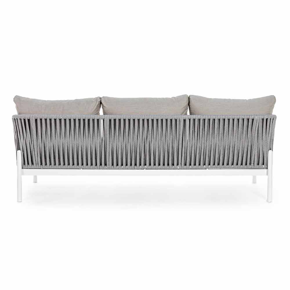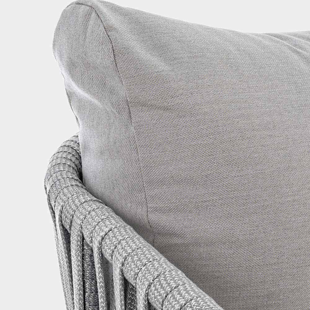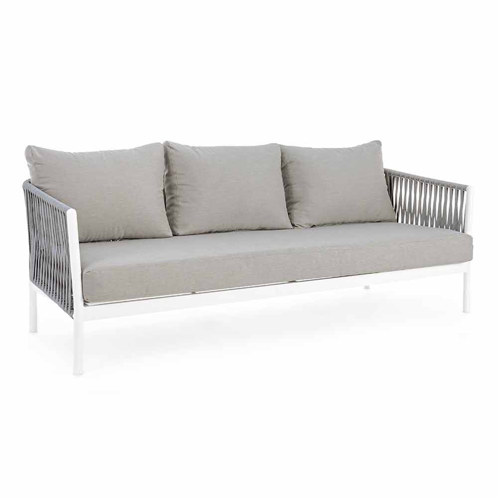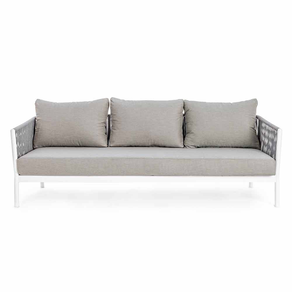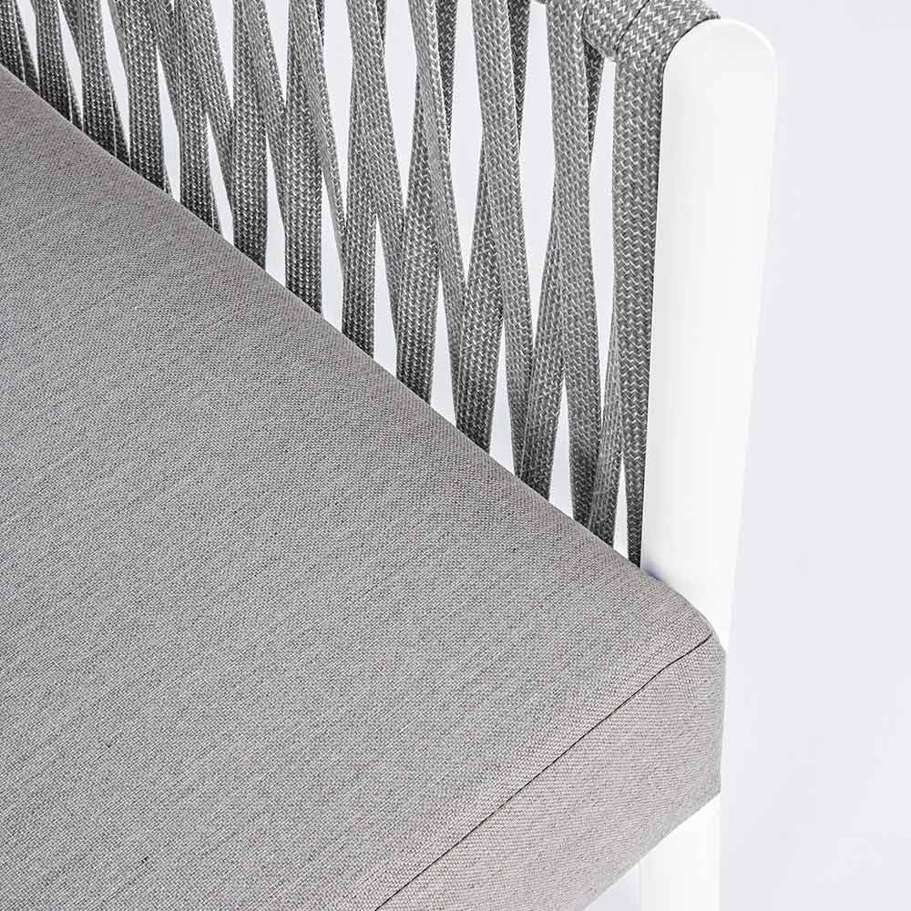 Moderní designová venkovní pohovka z bílého hliníku s vazbou lana a šedými polštáři.