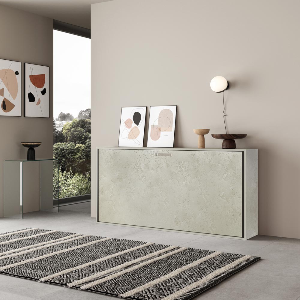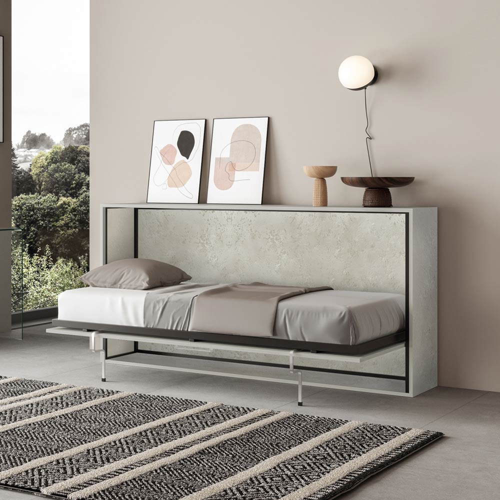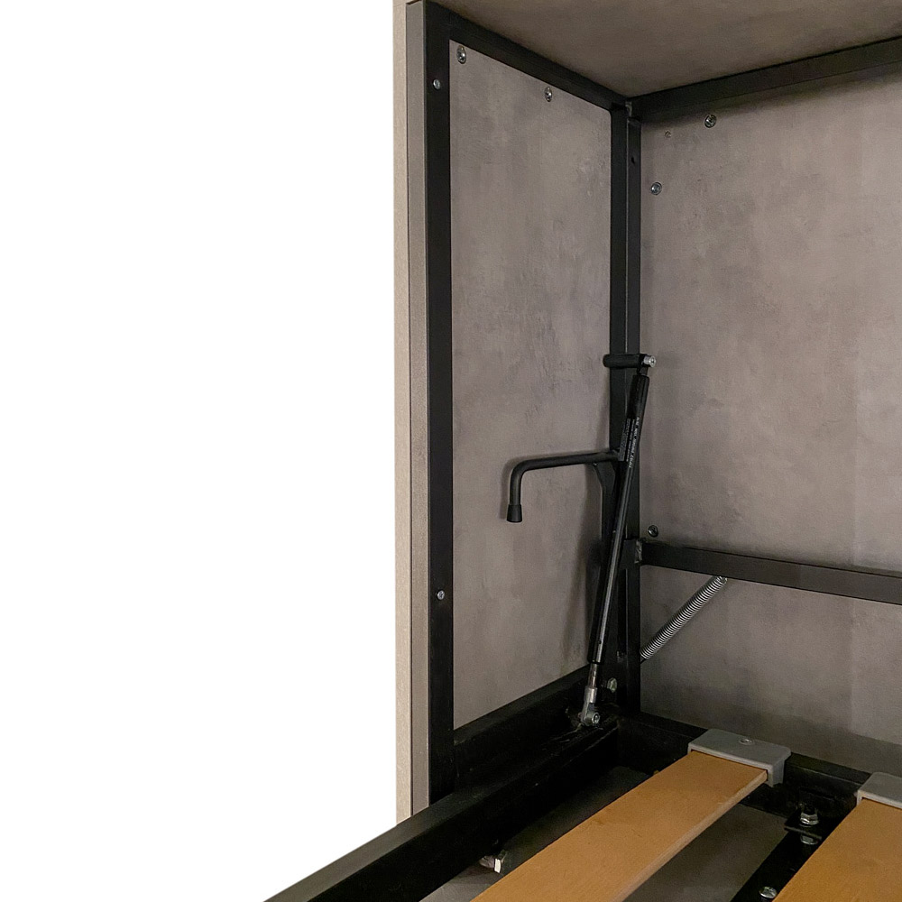 Horizontální skládací postel vyrobená z 18 mm silných dřevotřískových desek s povrchovou úpravou zušlechtěného kovu, spodní konstrukce postele z vyztuženého železa natřeného epoxidovým práškem v barvě reliéfního hliníku.