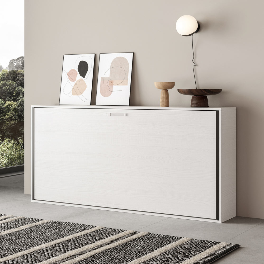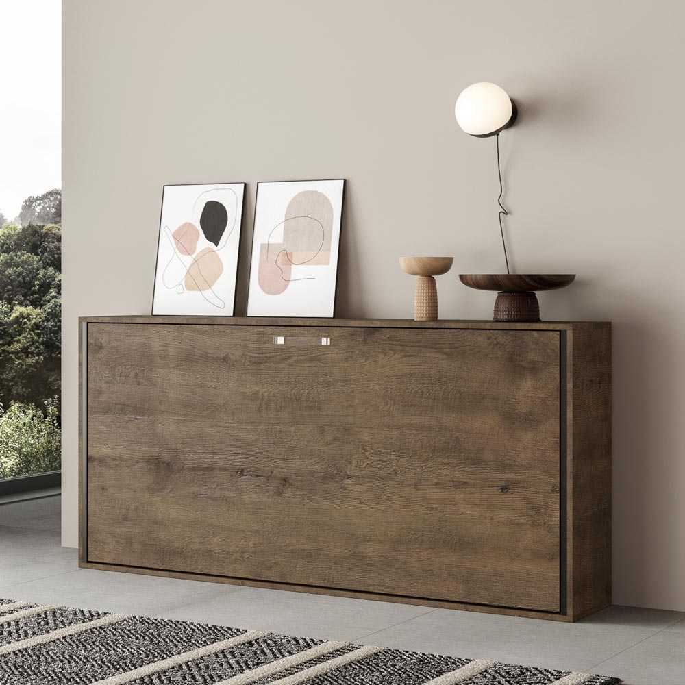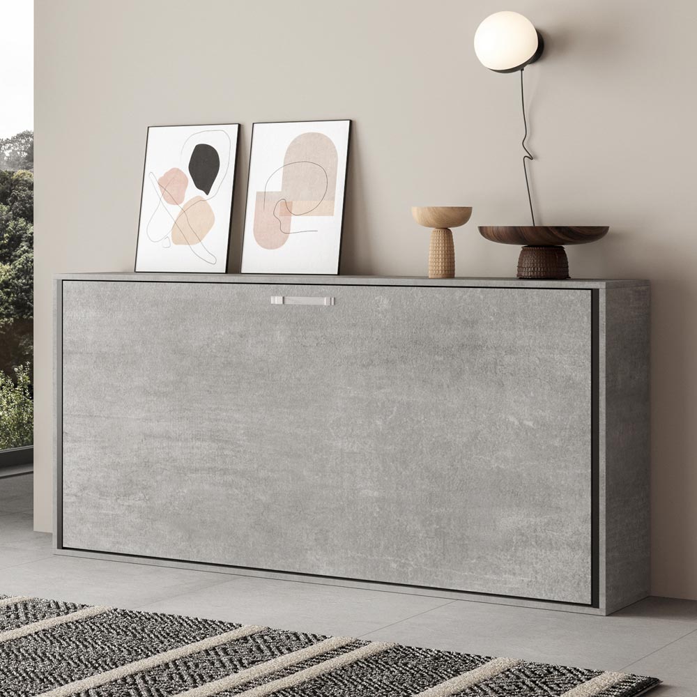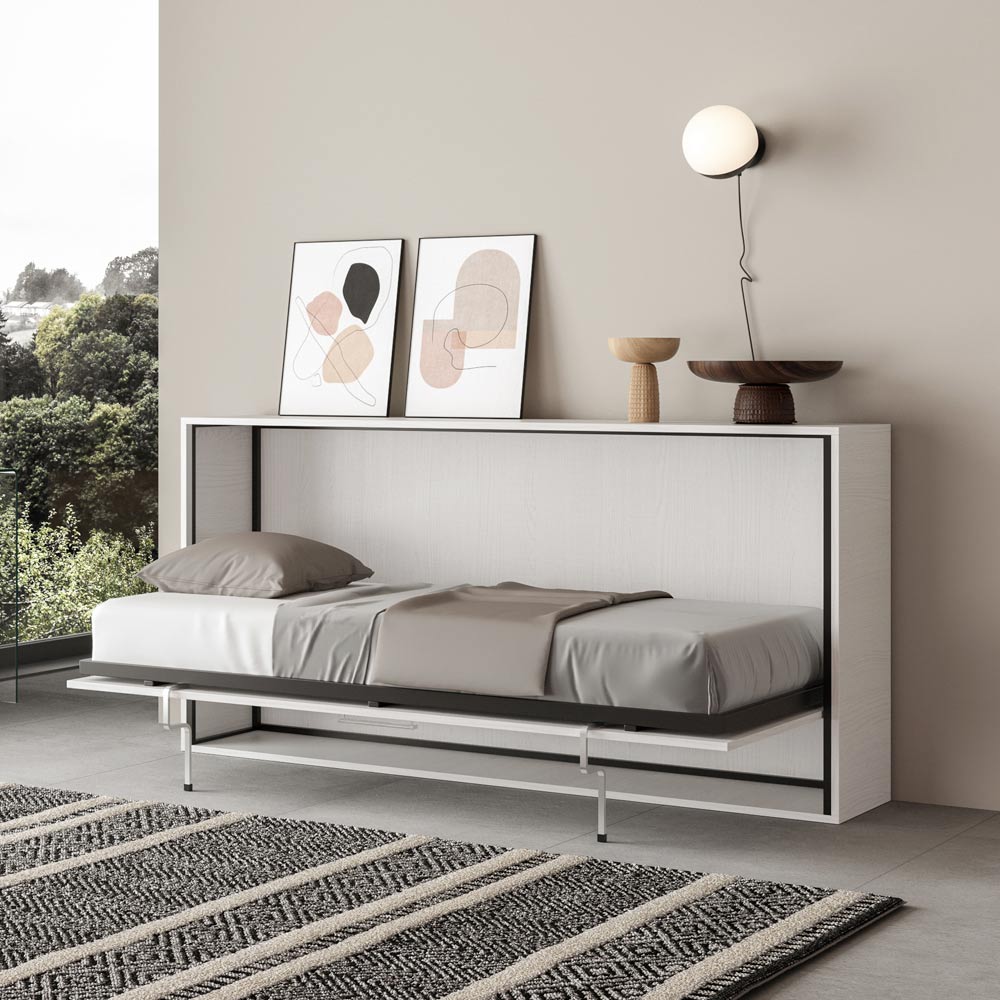 Horizontální skládací postel vyrobená z 18 mm silných dřevotřískových desek s povrchovou úpravou zušlechtěného kovu, spodní konstrukce postele z vyztuženého železa natřeného epoxidovým práškem v barvě reliéfního hliníku.
