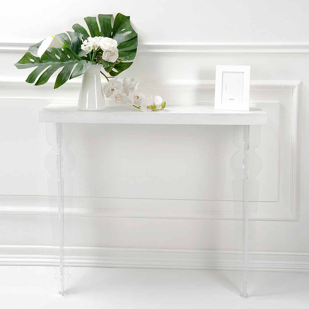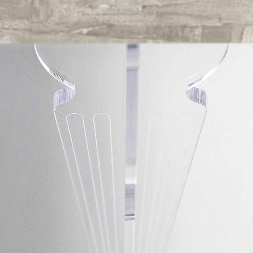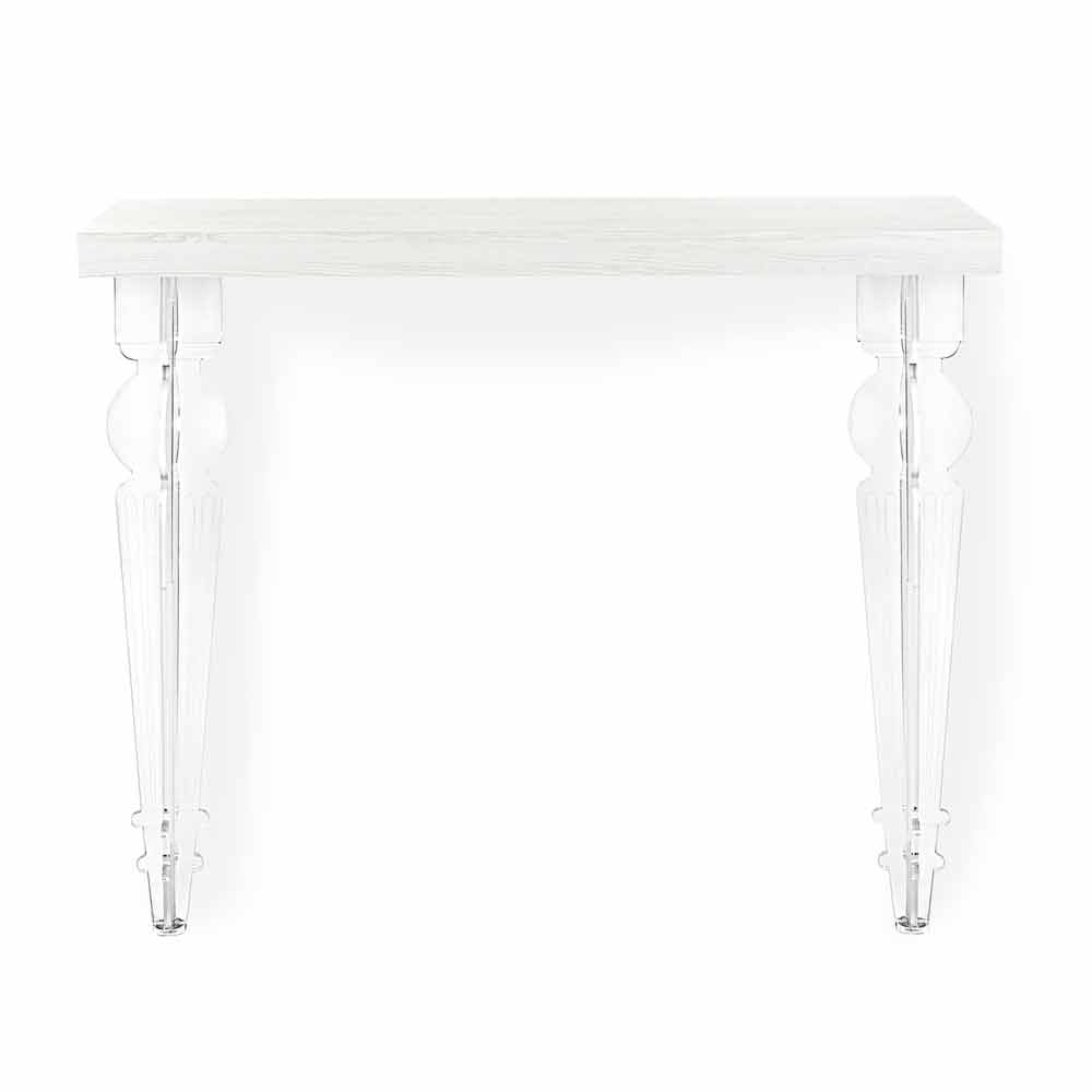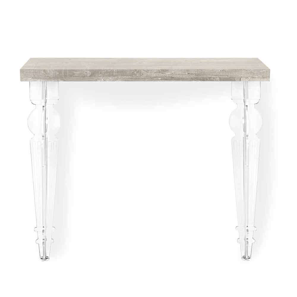 Stěnový konzolový stůl v bílém, šedém nebo kortenovém dřevě s otočenými nohami z plexiskla, design vyrobený v Itálii.