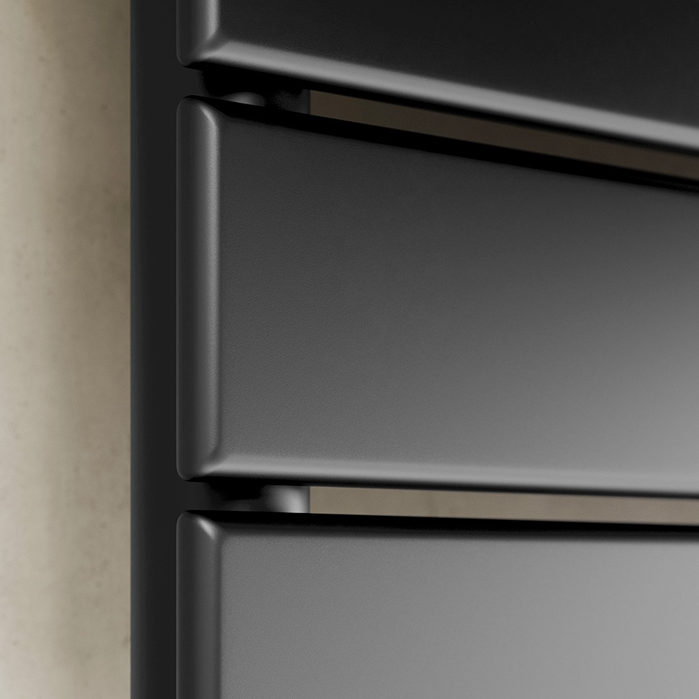 Tento černý ohřívač ručníků představuje čistou eleganci a sofistikovanost v každém detailu. Jeho moderní design a čisté geometrické linie dodávají každé koupelně nádech současného stylu a dokonale se integrují s různými styly dekorace, od těch nejminimalističtějších až po ty nejodvážnější.