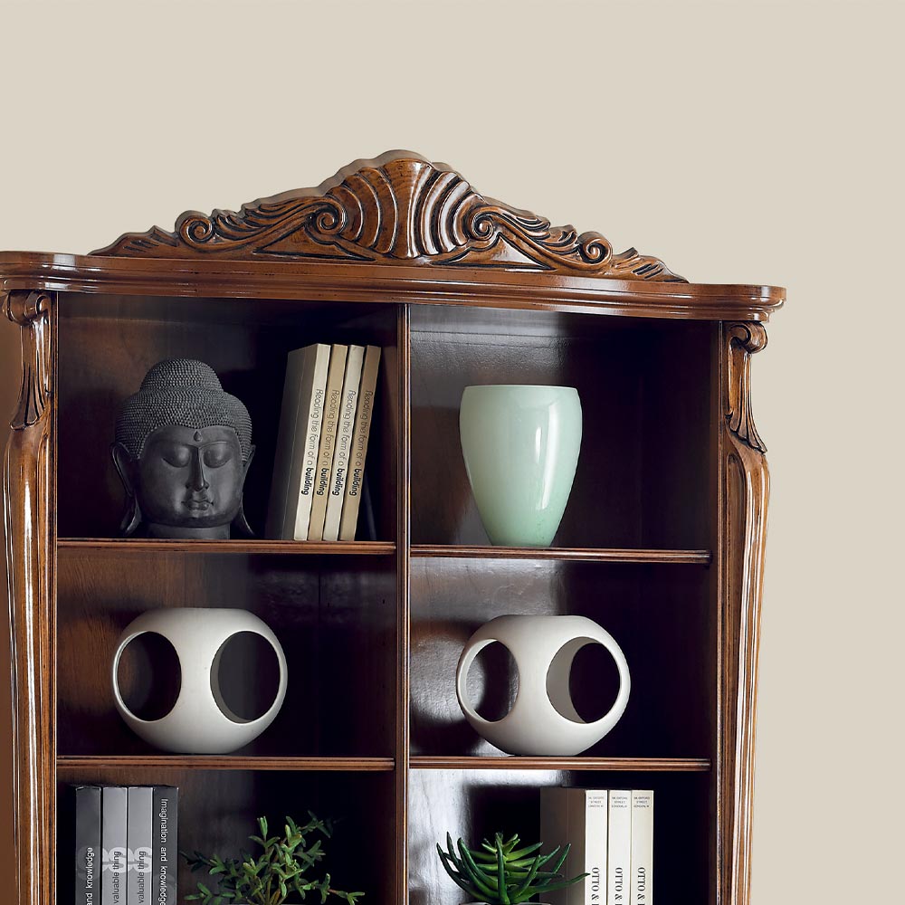 Elegantní knihovna klasického stylu vyrobená z intarzovaného ořechového dřeva Bassano . Tato knihovna má 8 praktických přihrádek a dvě dvířka, to vše korunuje originální kryt. Jedinečný a vytříbený doplněk, kompletně vyrobený v Itálii zručnými mistry řemeslníky , mistry umění, kteří dotvářejí každý doplněk s moudrostí a chutí pro eleganci. Výroba je prováděna s použitím ušlechtilých materiálů a ručním prováděním práce s maximální pečlivostí a profesionalitou, která odlišuje produkty Made in Italy .