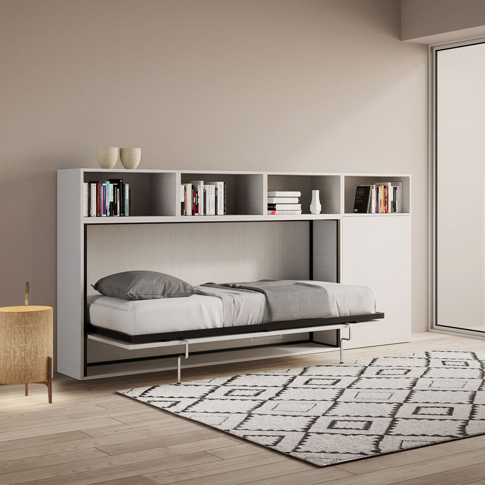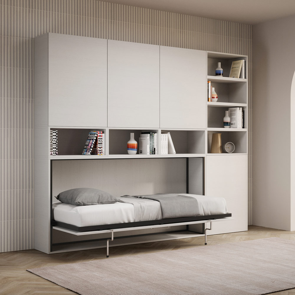 - SLOŽENÍ G : skládací jednolůžko, které se dá přeměnit na knihovnu/skříň s devíti přihrádkami (tři s dvířky a vnitřní policí a šest otevřených) - Zavřená postel u zdi: 266,5 x 39,2 x výška 194,4 cm / Rozložená postel: 266,5,9 x 106 x výška 194,4 cm