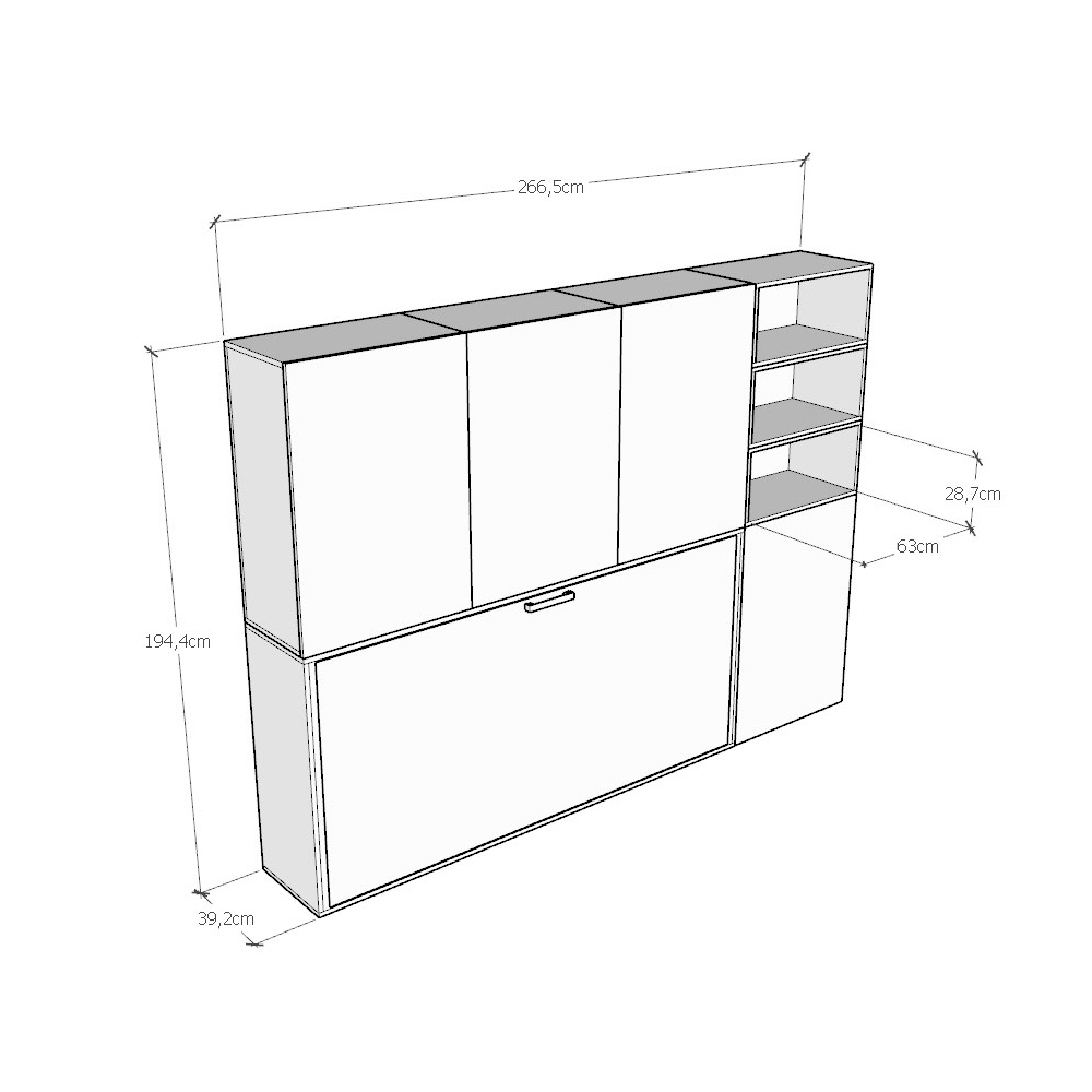 - SLOŽENÍ A: jedna přihrádka s dvířky a vnitřní policí a čtyři otevřené přihrádky - Zavřená postel u zdi: 266,5 x 39,2 x výška 129,7 cm / Otevřená postel: 266,5 x 106 x výška 129,7 cm