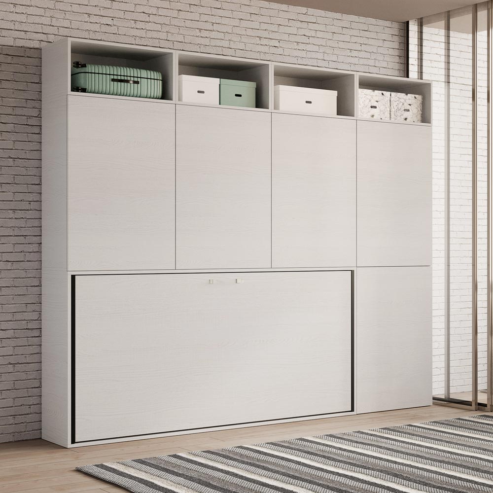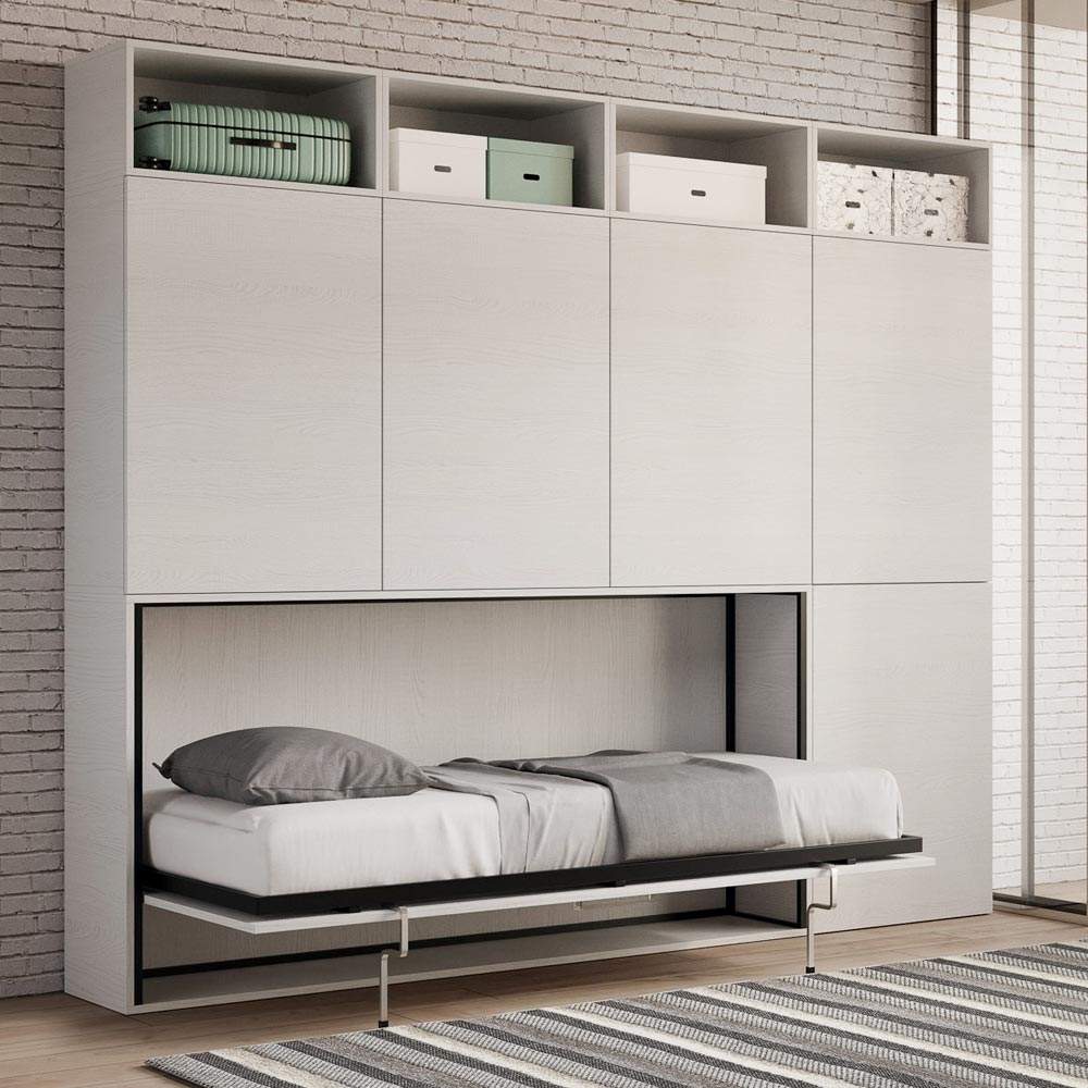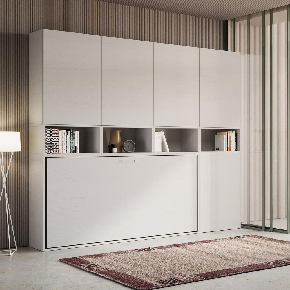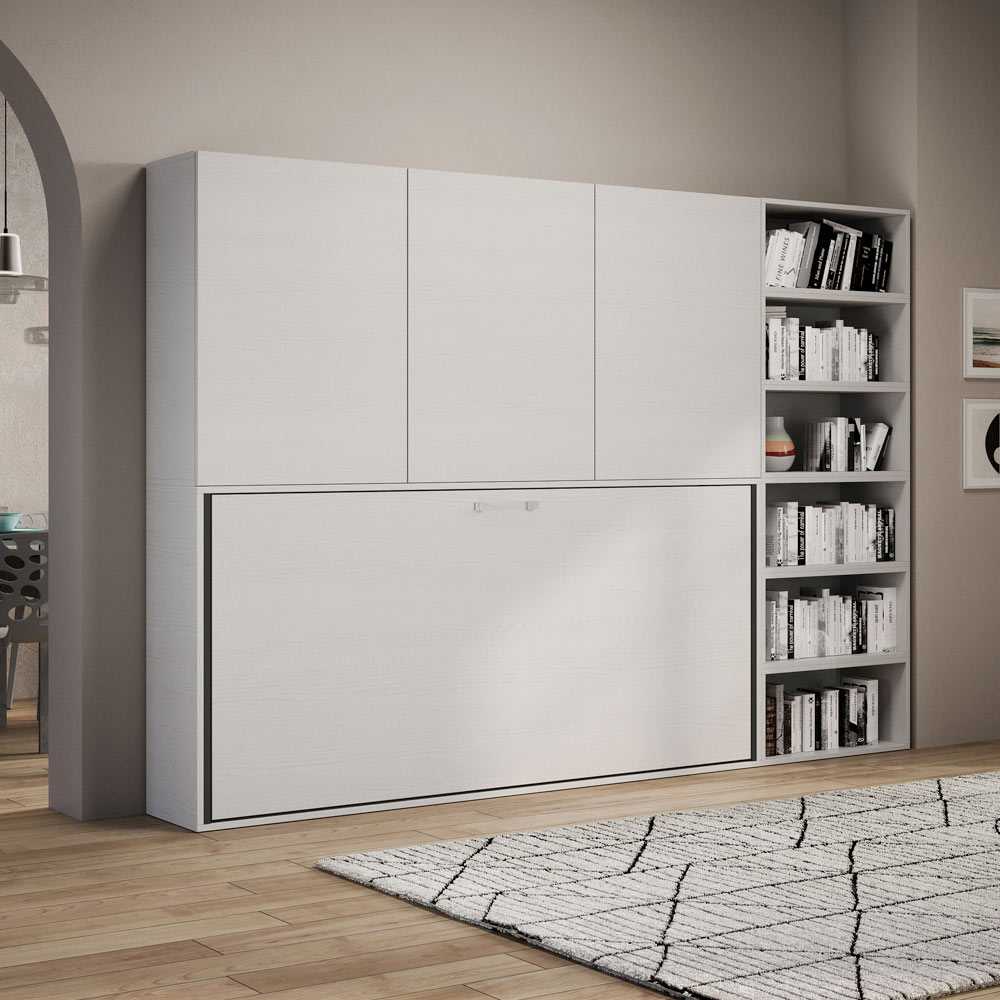 - SLOŽENÍ C : skládací jednolůžko vložené do multifunkční knihovny. Knihovna/skříň má devět přihrádek různých velikostí (pět s dvířky, každá s vnitřní policí a čtyři otevřené přihrádky) - Zavřená postel u zdi: 266,5 x 39,2 x výška 226,7 cm / Otevřená postel: 266,5 x 106 x výška 226,7 cm
