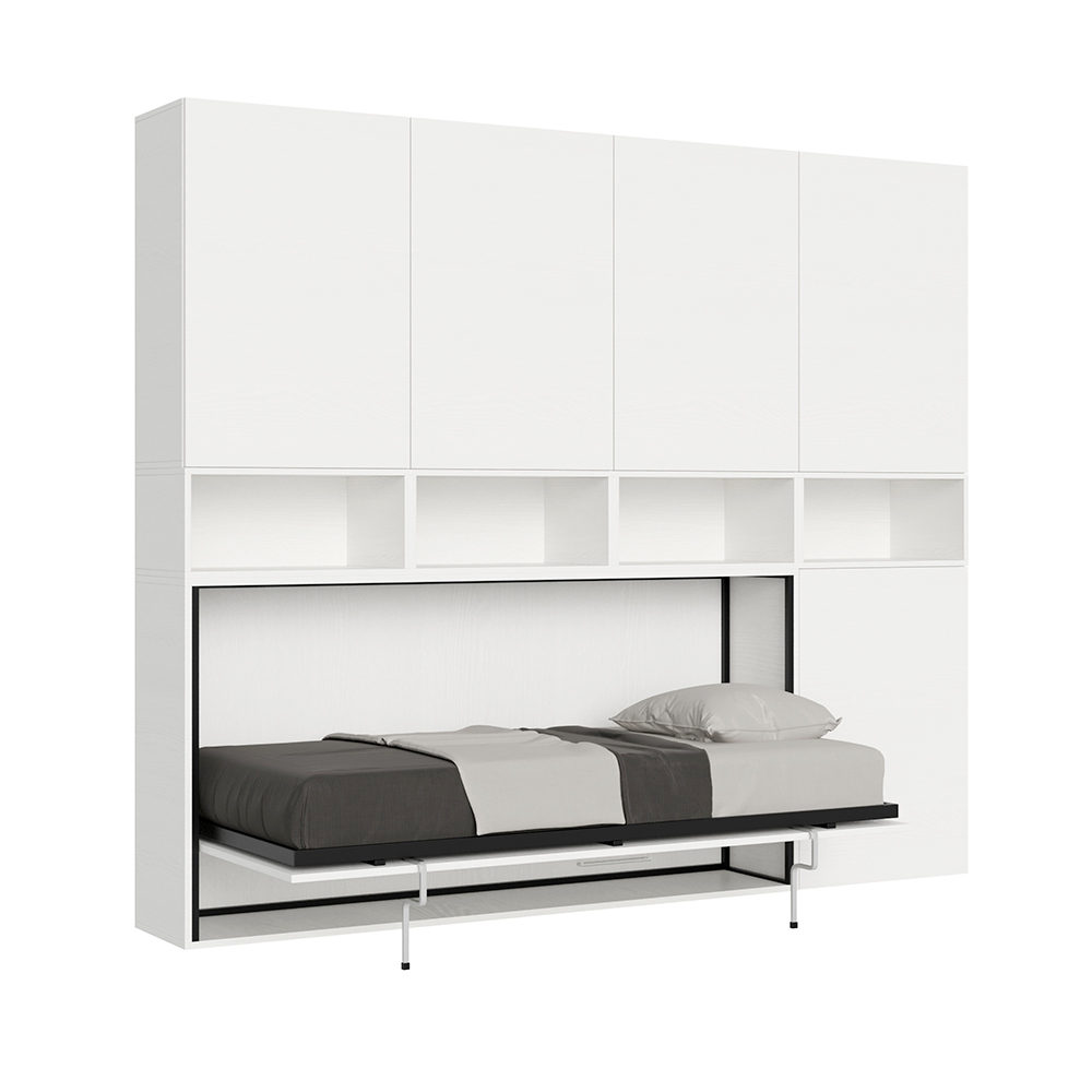Horizontální skládací postel s konstrukcí z 18 mm silných dřevotřískových desek s povrchovou úpravou zušlechtěného kovu, spodní konstrukce postele z vyztuženého železa natřeného epoxidovým práškem v barvě reliéfního hliníku.
