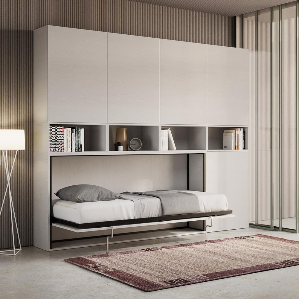 Jednolůžko s rozkládací postelí, která se integruje s nábytkem vyrobeným v Itálii
