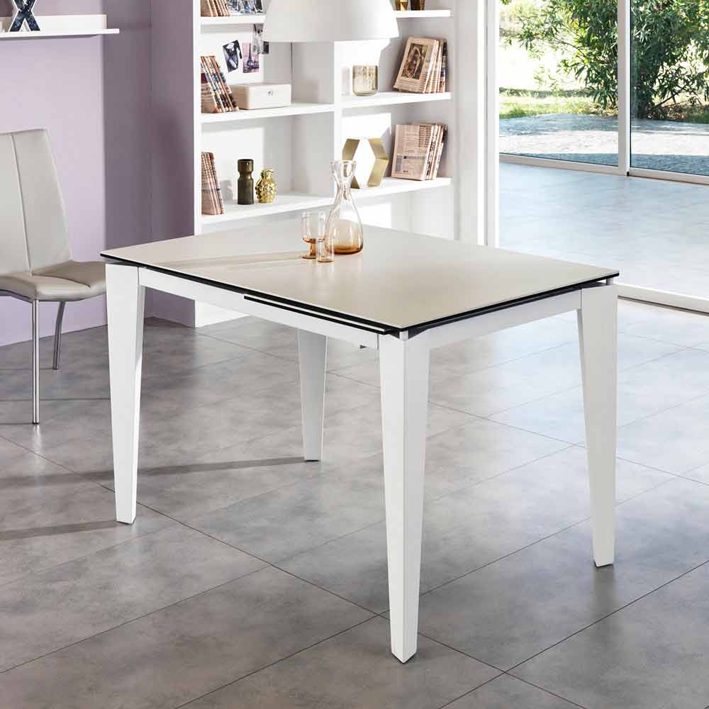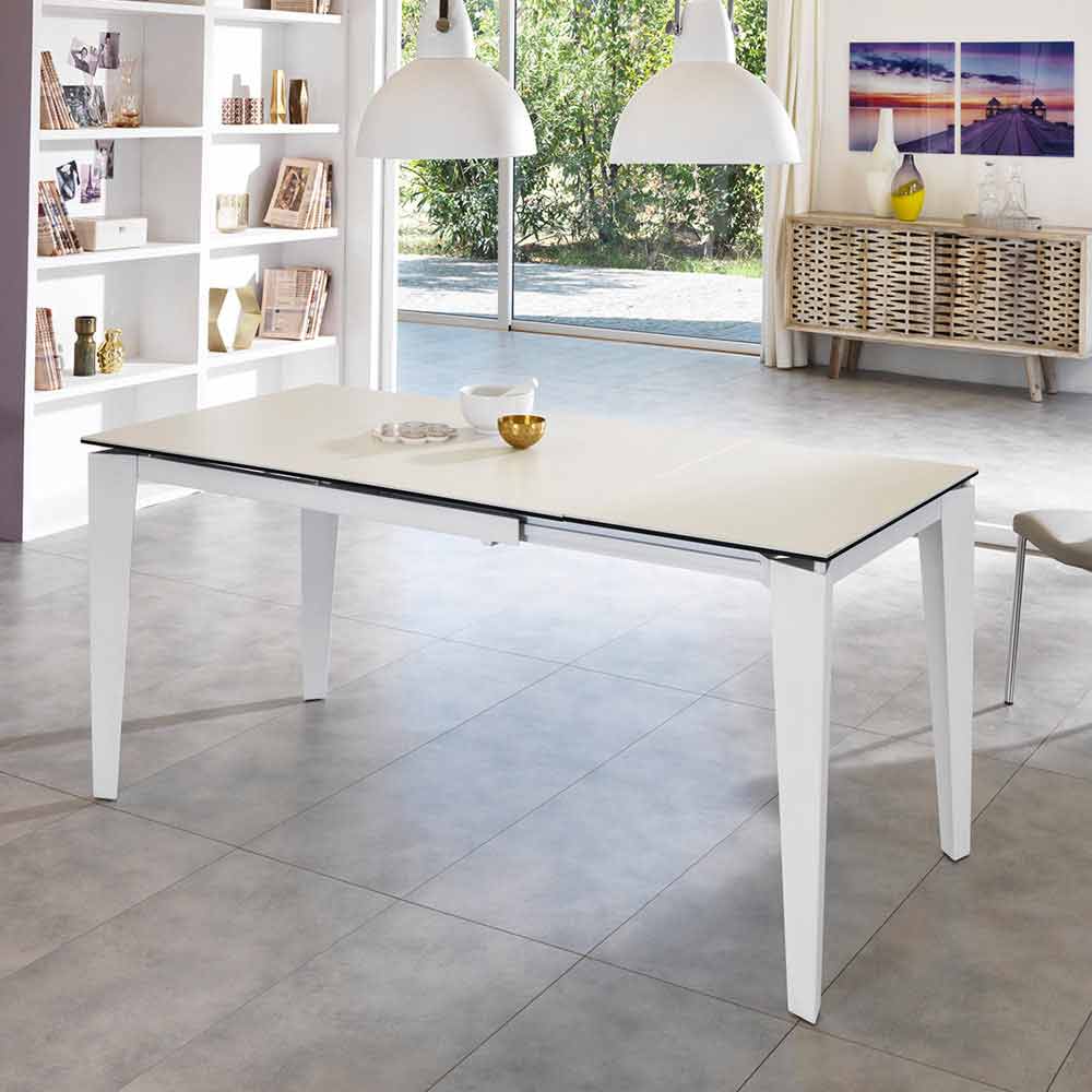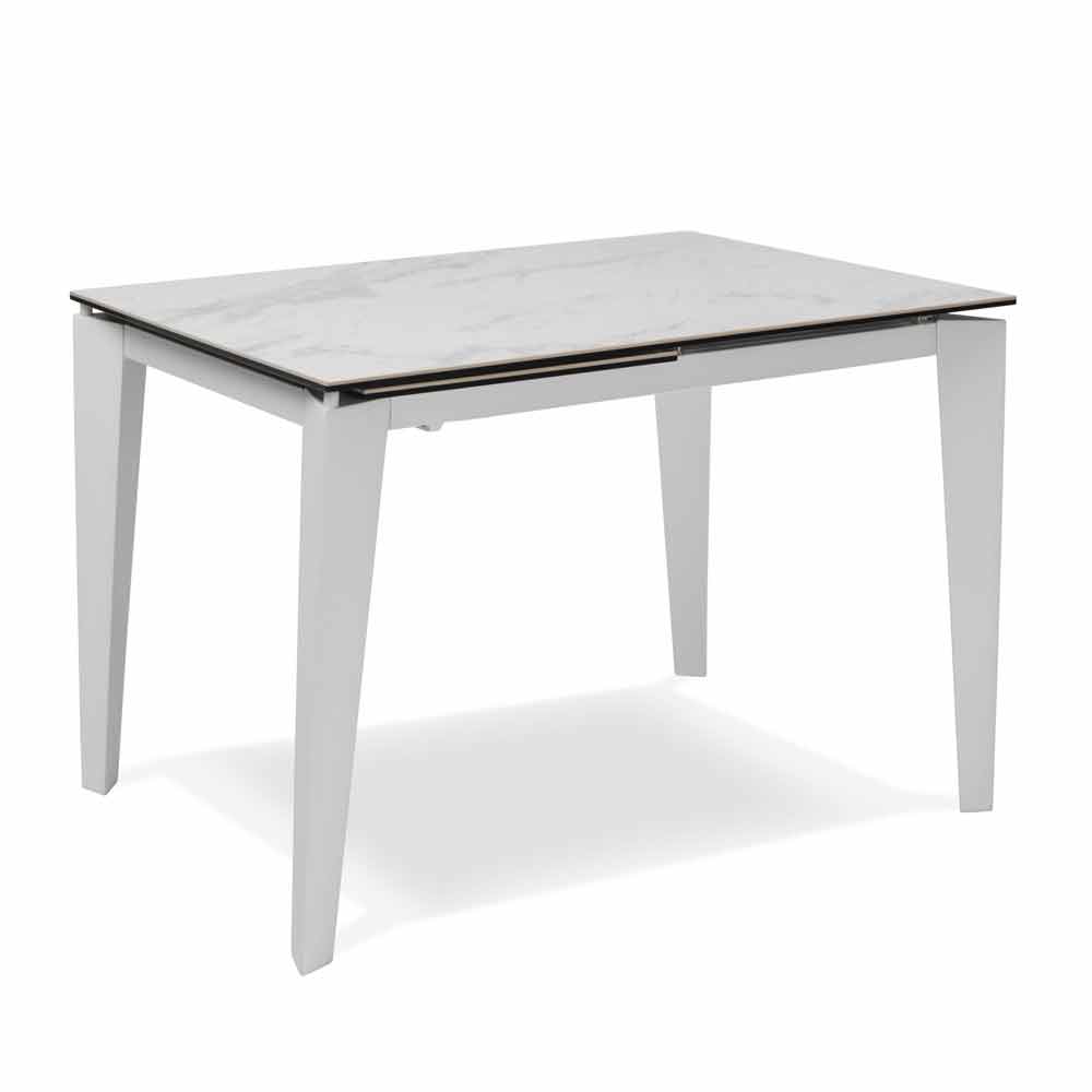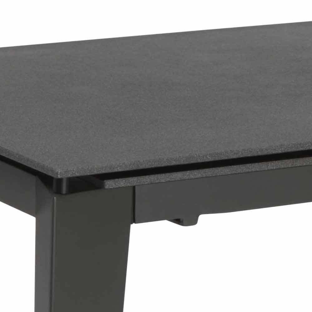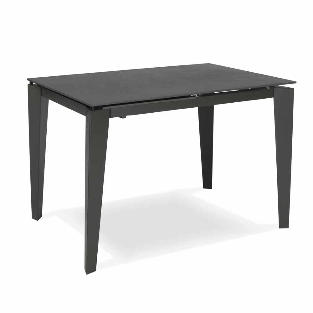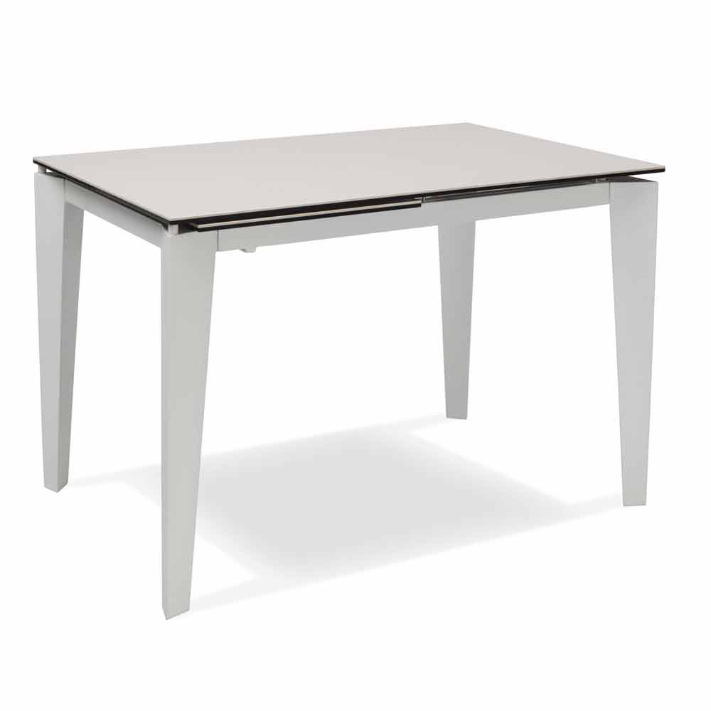 Roztažitelný obdélníkový stůl s matně lakovaným kovovým podstavcem. Horní a nástavec ze skla a keramiky (spodní vrstva ze skla, horní vrstva z keramiky). Díky praktickému prodloužení je možné stůl rozšířit až na délku 170 cm.