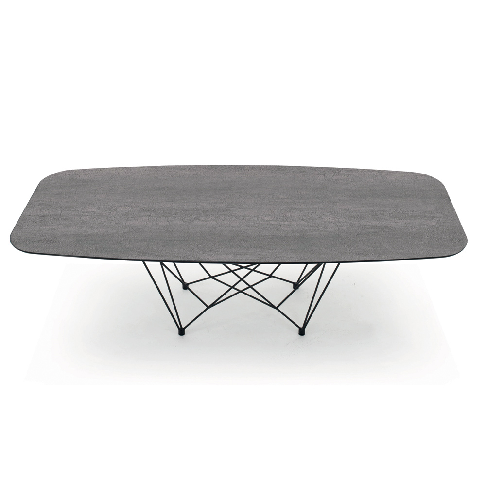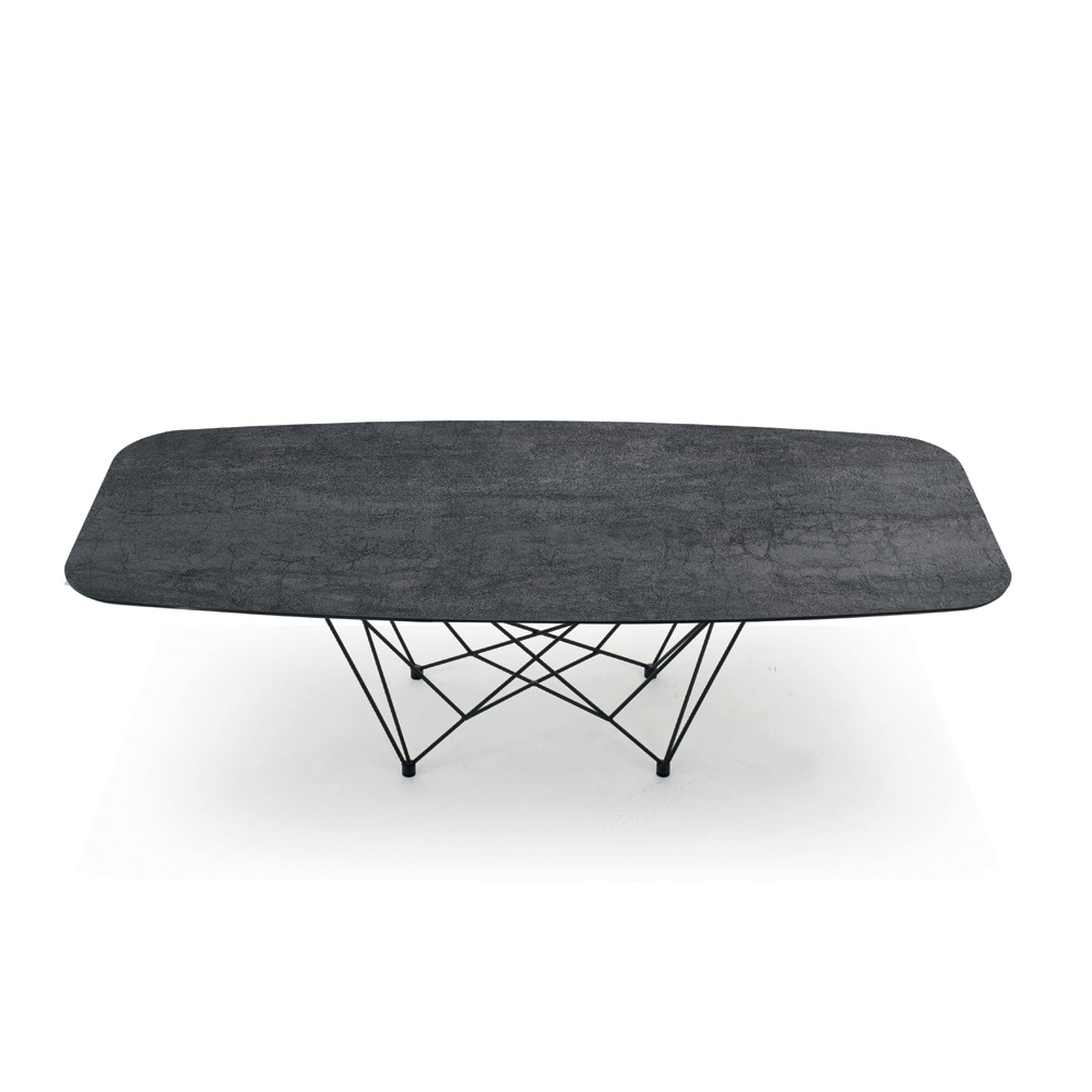 Jídelní stůl ve tvaru sudu z laminované keramiky a černé oceli Made in Italy.
