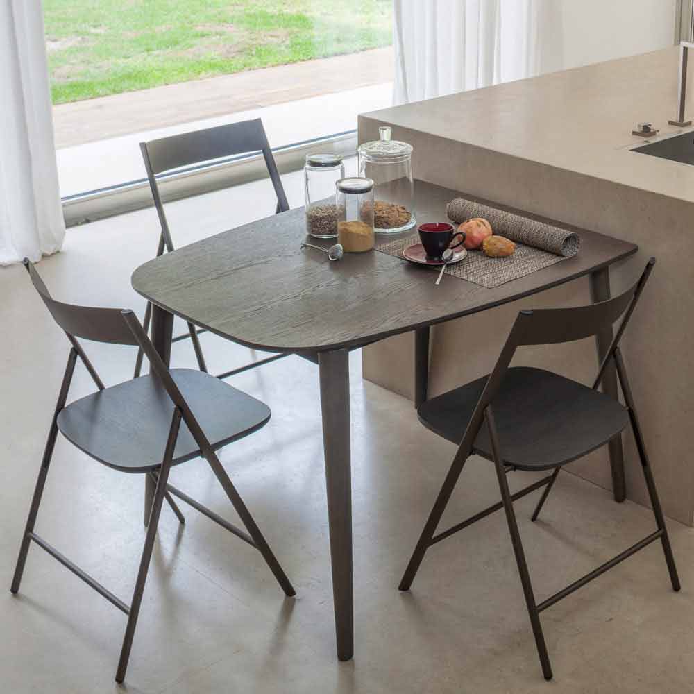 Rozkládací a tvarovaný jídelní stůl z dýhovaného dřeva vyrobený v Itálii.