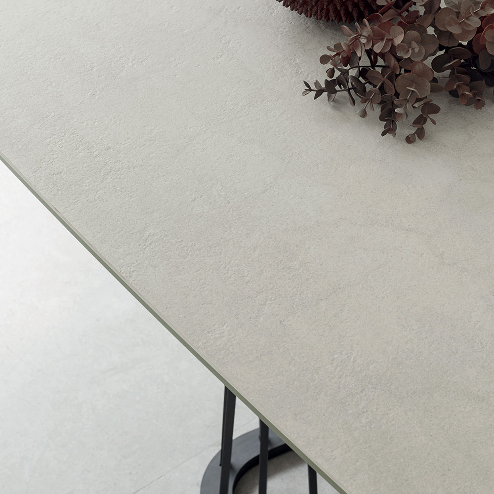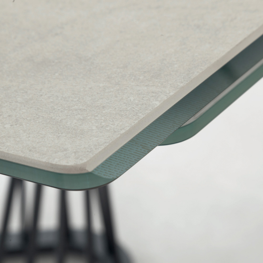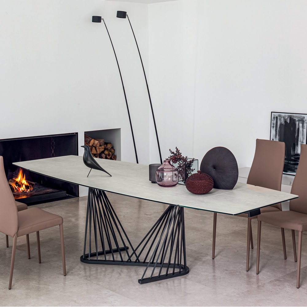 Rozkládací jídelní stůl z keramiky a podnoží s kovovými lanky vyrobený v Itálii.
