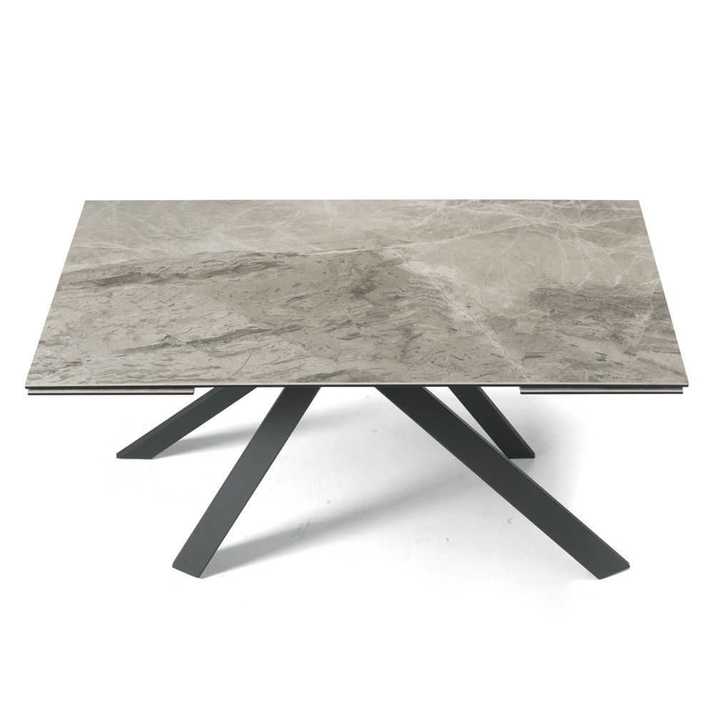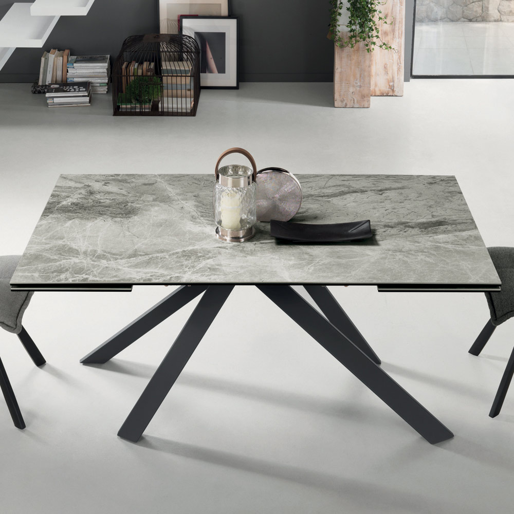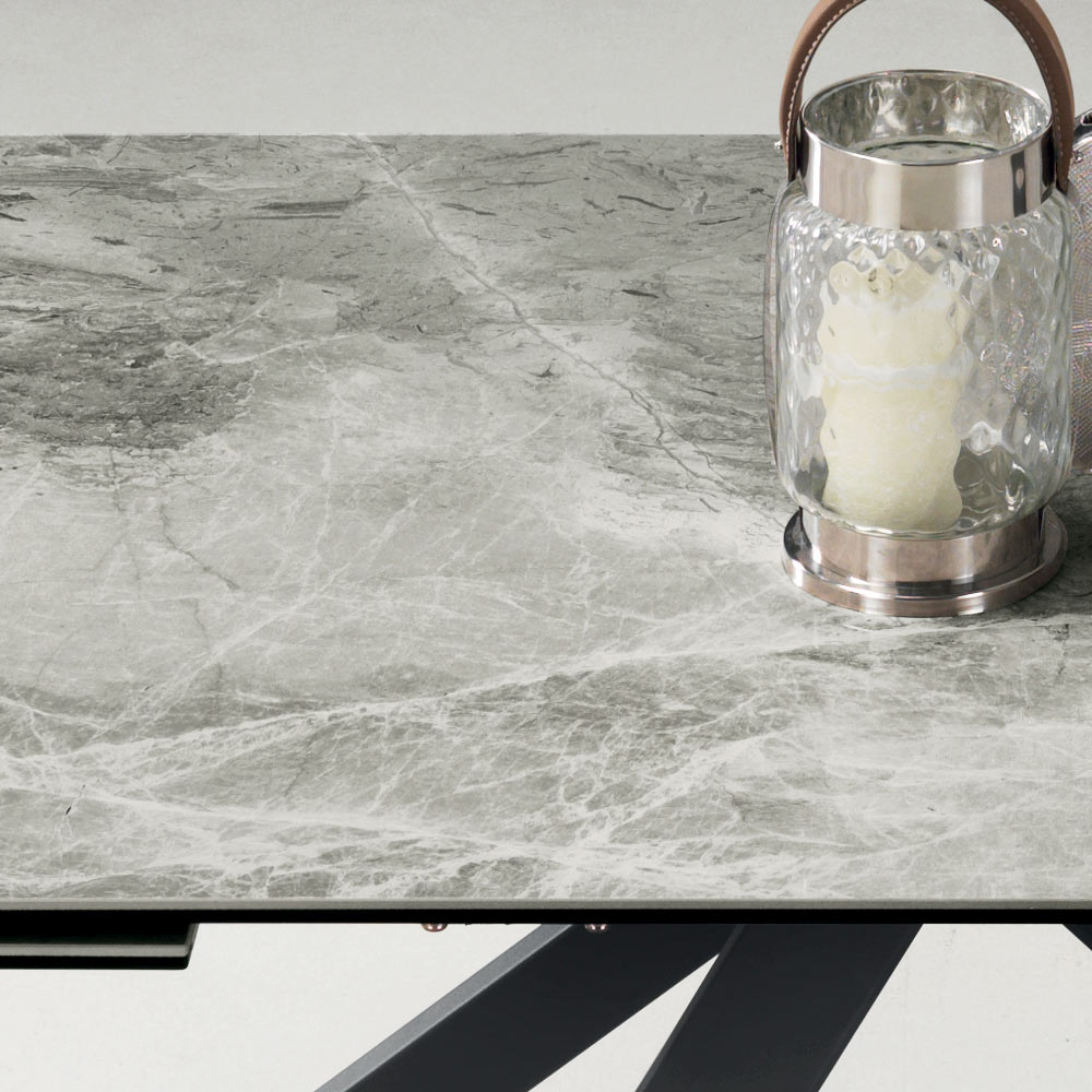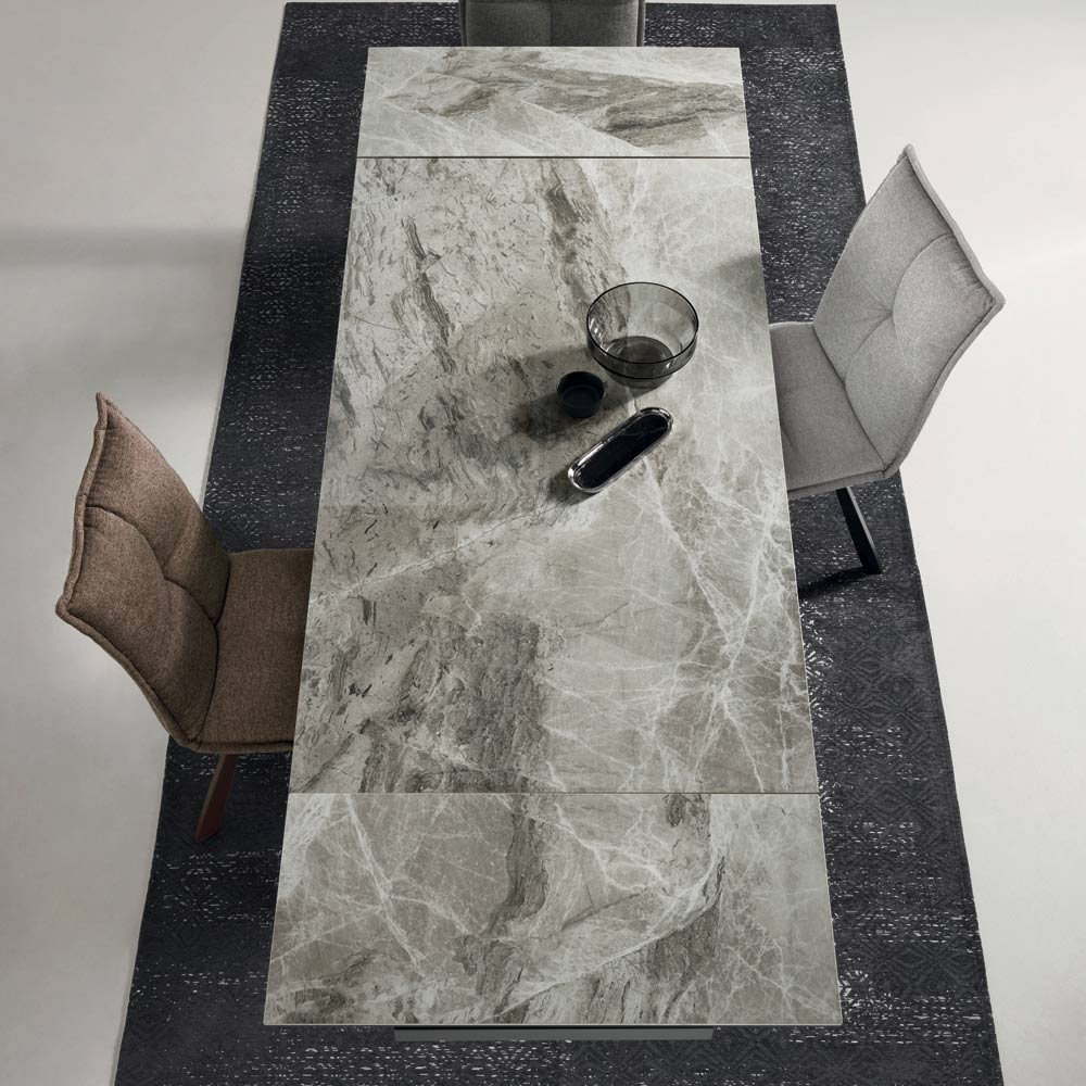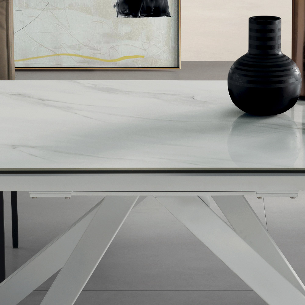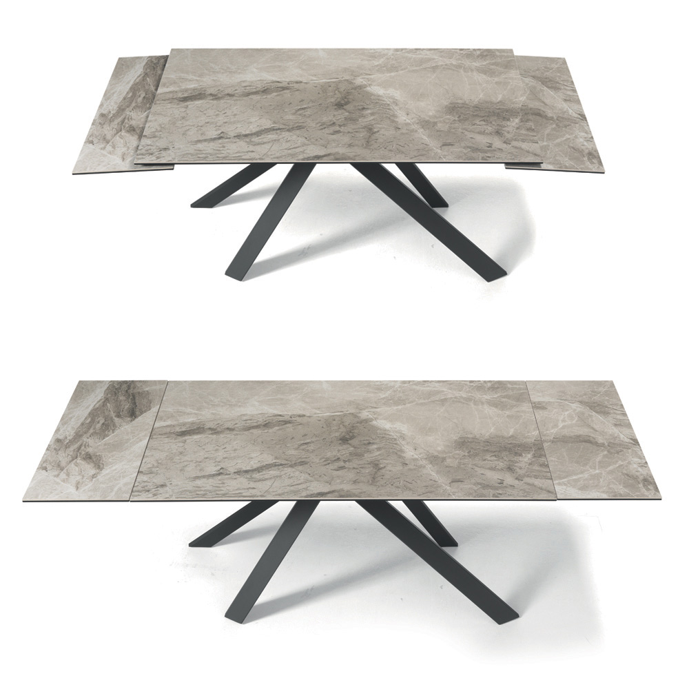 Jídelní stůl s deskou z porcelánové kameniny s mramorovým efektem rozšiřitelný až na 240 cm díky dvěma dodaným 40 cm prodlužovacím listům a lakované kovové konstrukci. Tento produkt je ideální pro ty, kteří milují organizování obědů a večeří s přáteli, aniž by museli obětovat styl a eleganci.