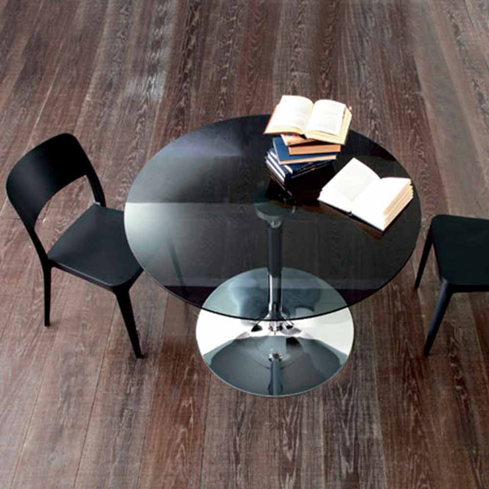 Jídelní stůl vyrobený v Itálii s kulatou skleněnou deskou (tl. 10 mm) a středovou základnou sloupku z chromovaného kovu .