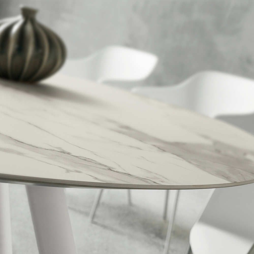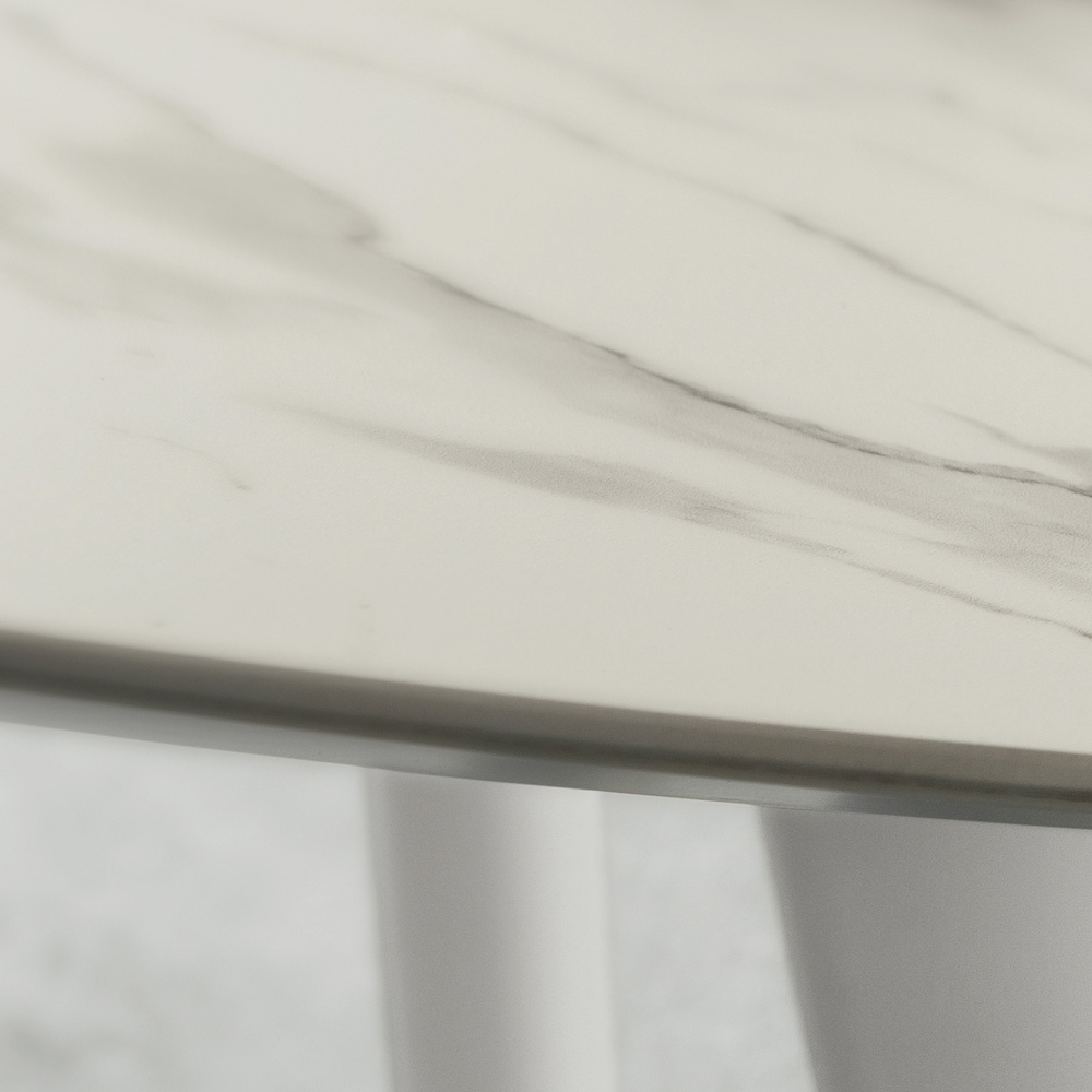 hliníkovými nohami lakovanými epoxidovou práškovou barvou v bílém provedení. Ze setkání mezi nadčasovou elegancí mramorového efektu a kamenným efektem a moderním nádechem hliníku se zrodil kus nábytku s