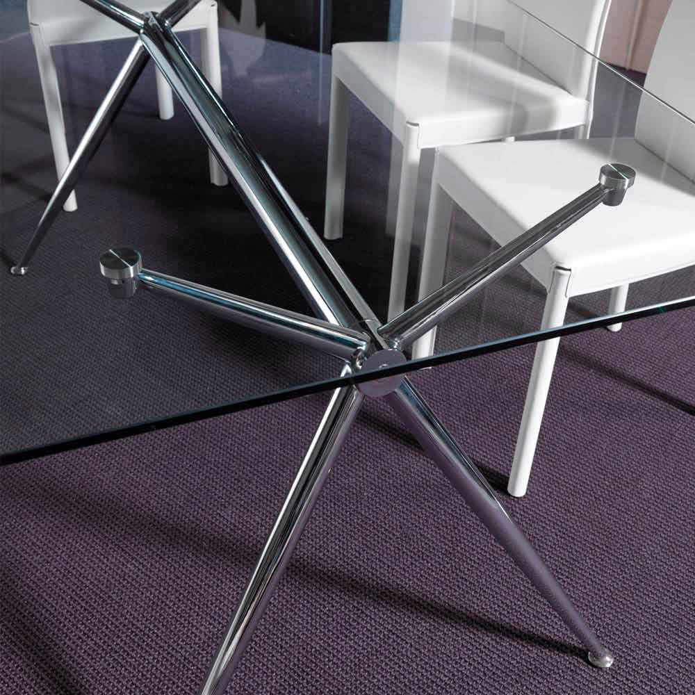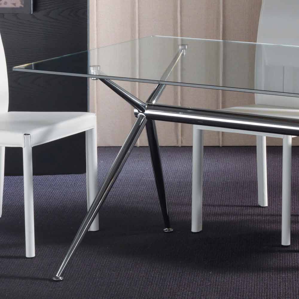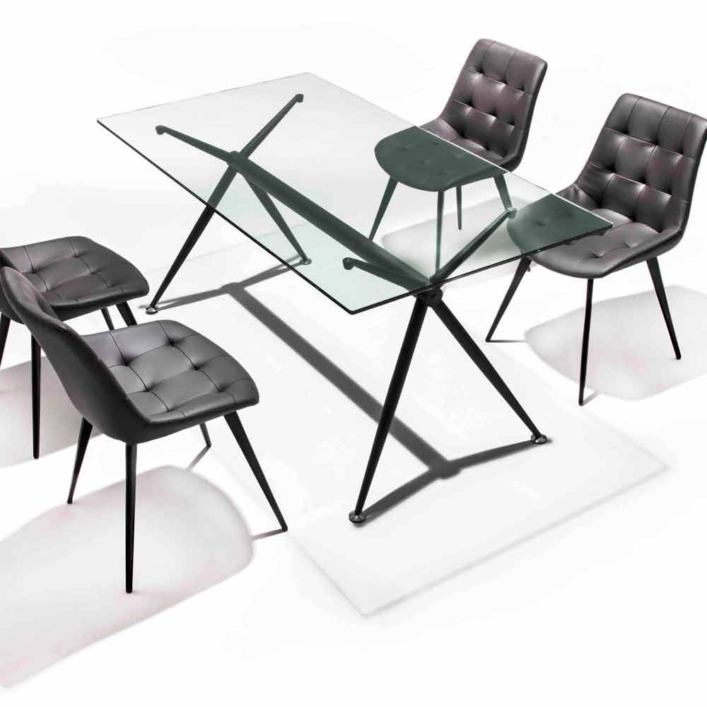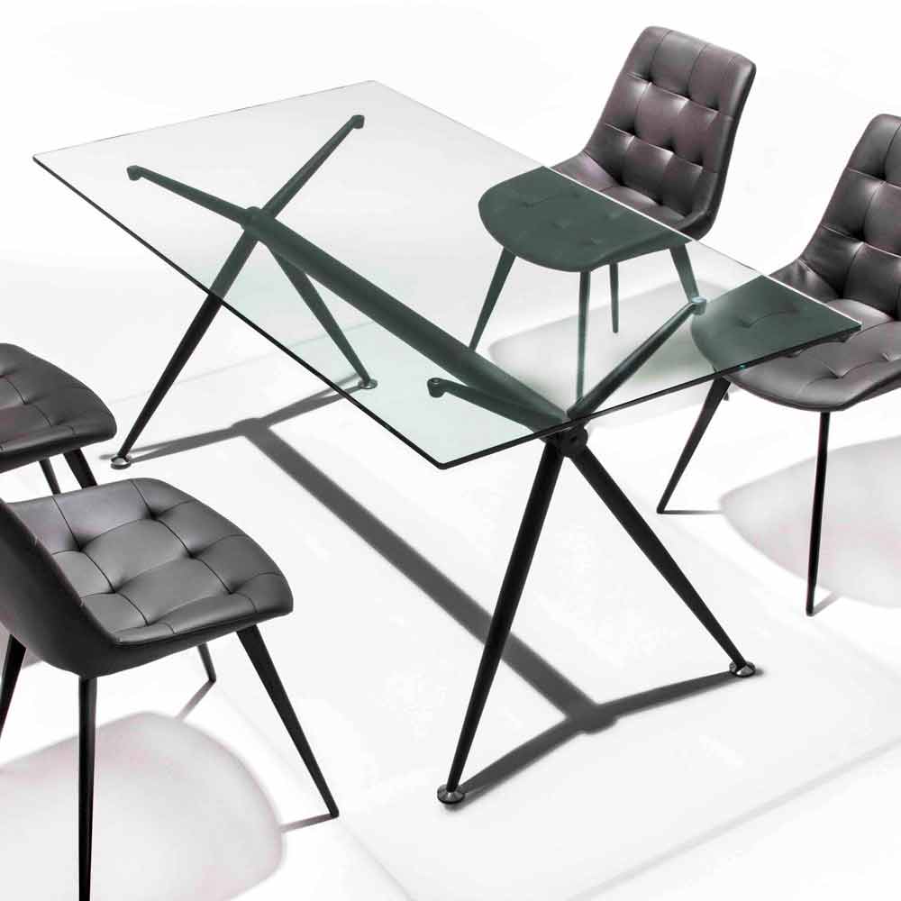 Jídelní stůl s průhlednou tvrzenou skleněnou deskou.