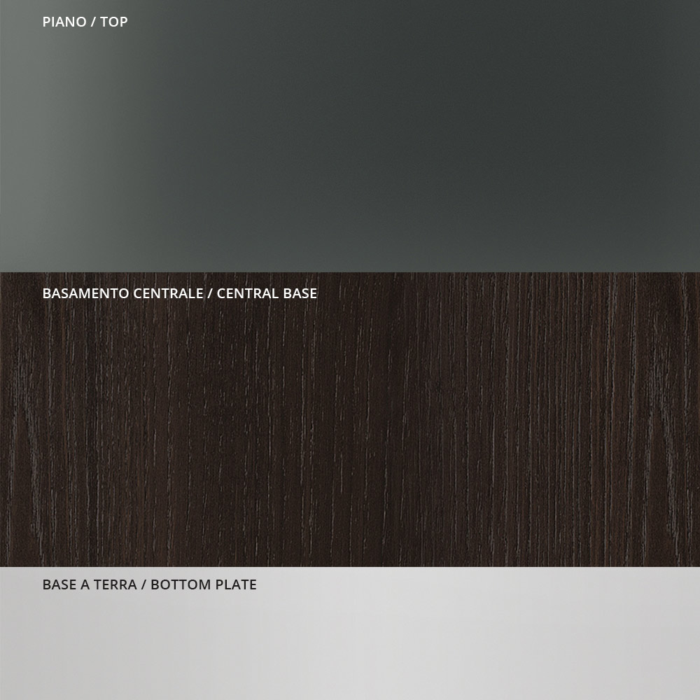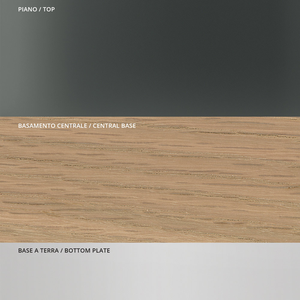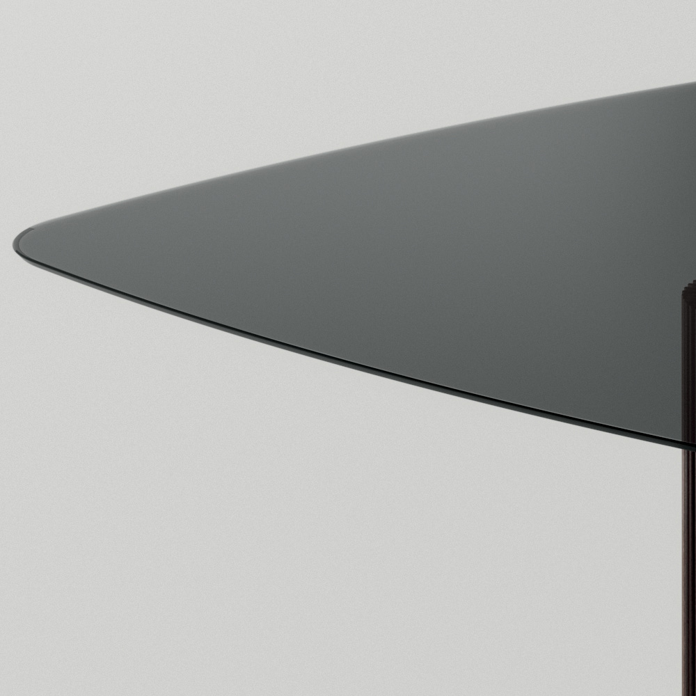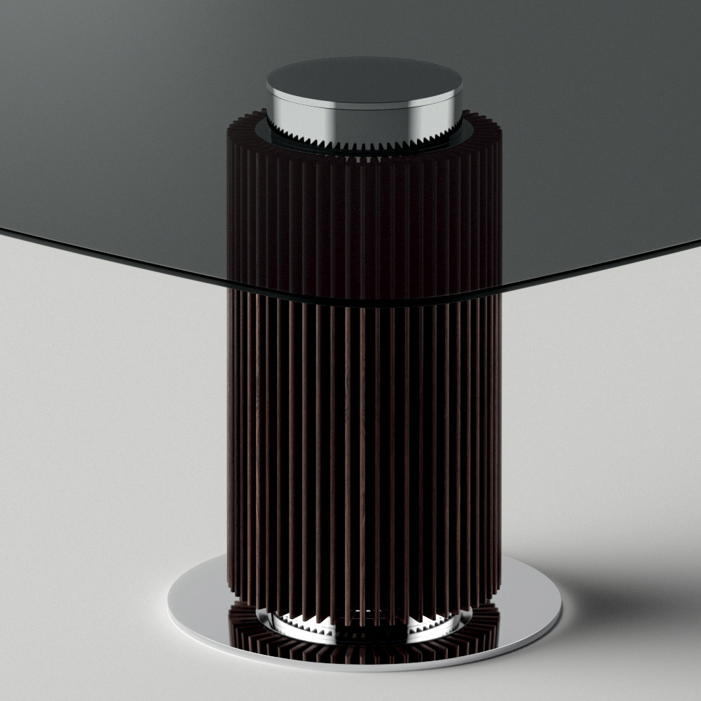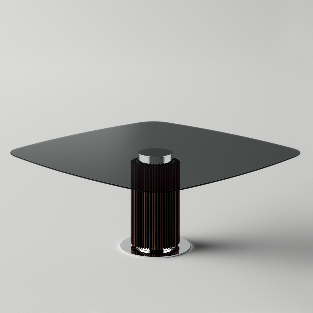 Čtvercový stůl s deskou z kouřového skla a dřevěnou podnoží Made in Italy.