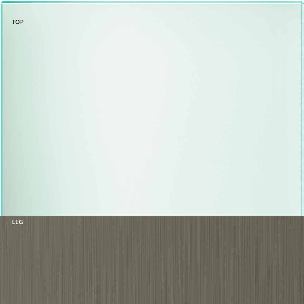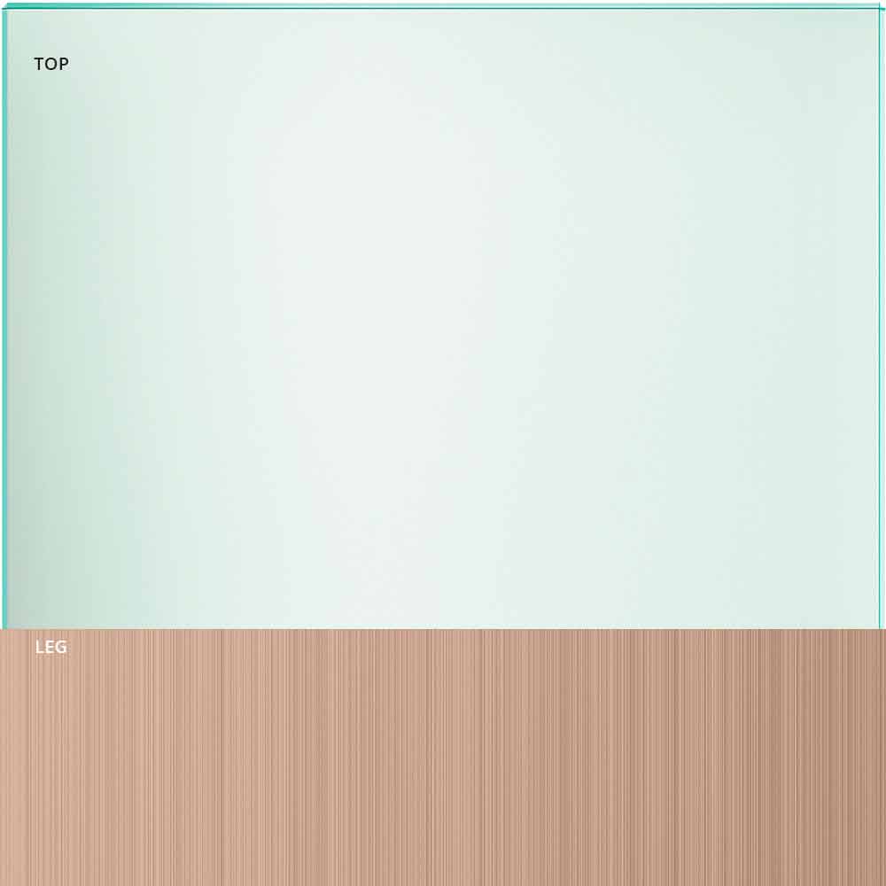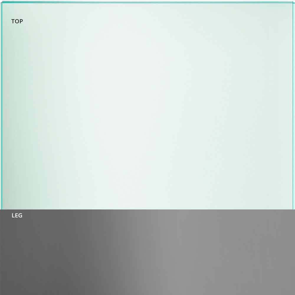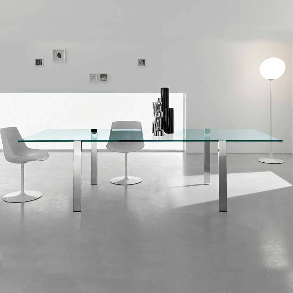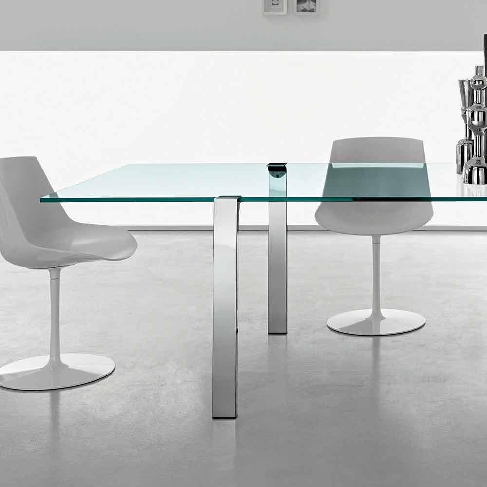 Skleněný jídelní stůl s kovovými nohami různých velikostí a povrchových úprav vyrobený v Itálii.