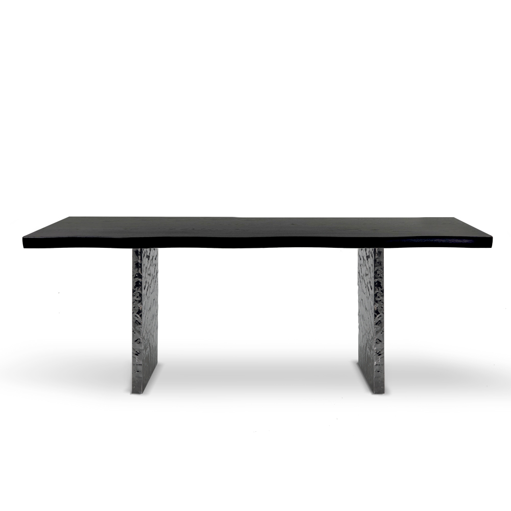 Designový stůl s dýhovanou dřevěnou deskou a podnoží z tepané oceli ručně vyrobený v Itálii.