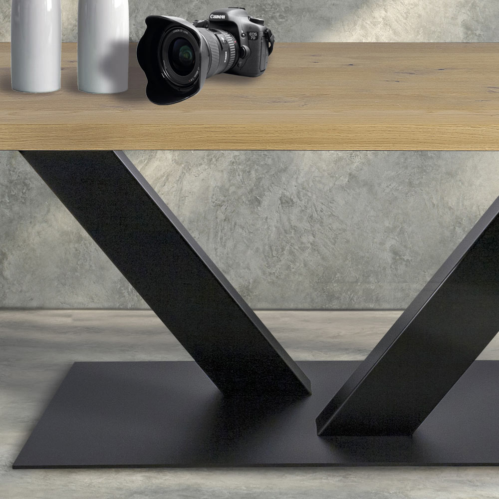 Dřevěný stůl pokovený dýhovaným dubem s vroubkováním a kovovou podnoží Made in Italy.
