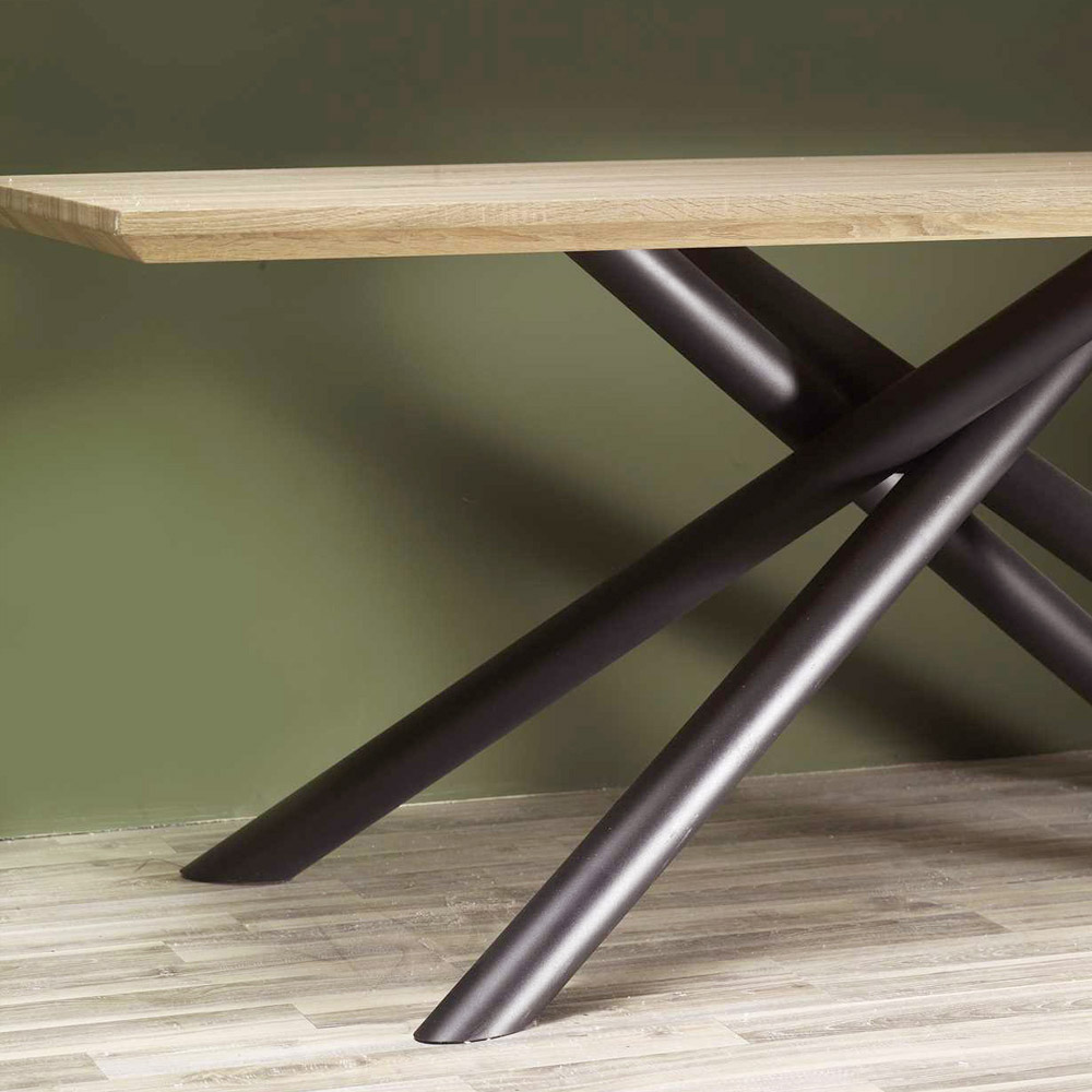 Tento moderní stůl je dokonalou kombinací elegance a funkčnosti . Černý práškově lakovaný kovový rám poskytuje robustní a stabilní základnu, kterou umocňují geometrické linie zkřížených nohou, jež stolu dodávají nádech rafinovaného industriálního stylu .