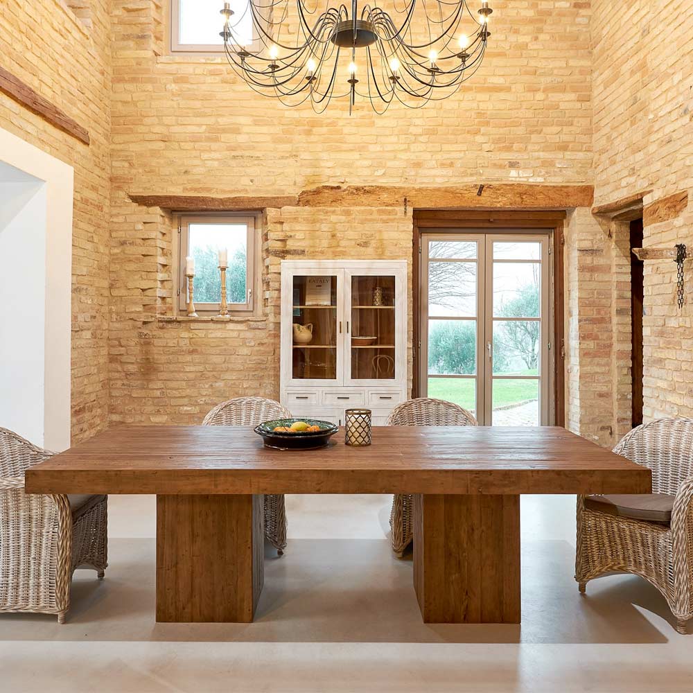 Vyrobený jídelní stůl z recyklovaného dřeva v přírodní kávové barvě s dvojitým podstavcem .