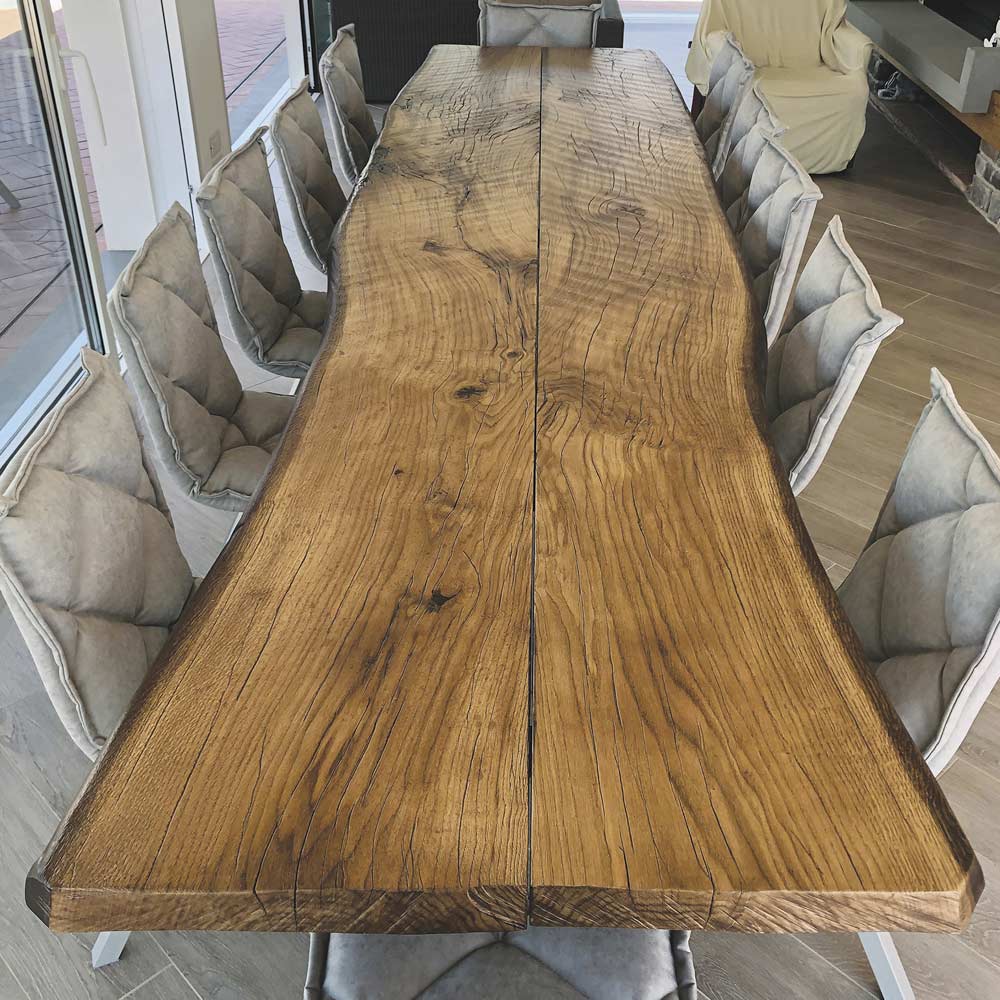 Vršek se získává přímo z kmene. Dvě poloviny jsou získány ze světských dubových kmenů a spojeny dohromady, aby vytvořily jedinečné kusy s proměnlivou šířkou od 90 do 100 cm. Kůra stromu je zachována ve své přirozenosti a vytváří mimořádný efekt.