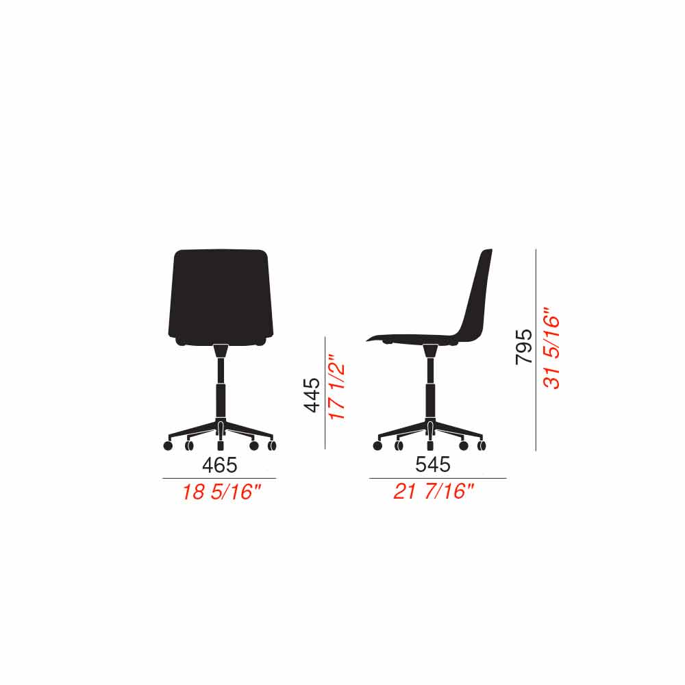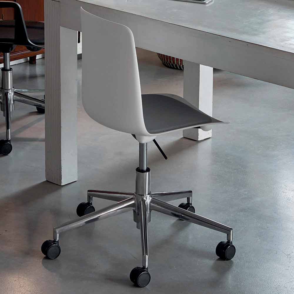 Charita se skládá z polypropylenového sedadla, které je k dispozici v 7 různých barvách, a leštěné hliníkové konstrukce také vybavené otočnou základnou pro větší pohodlí a větší funkčnost.