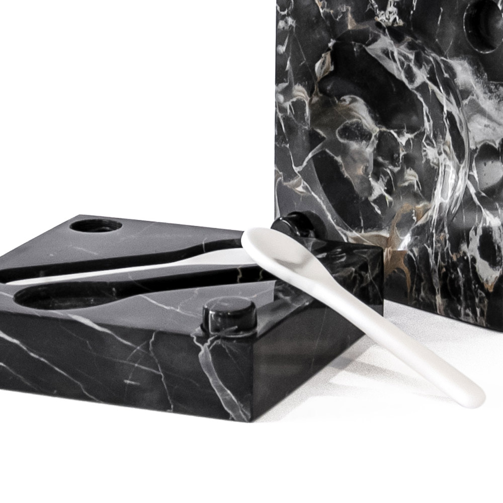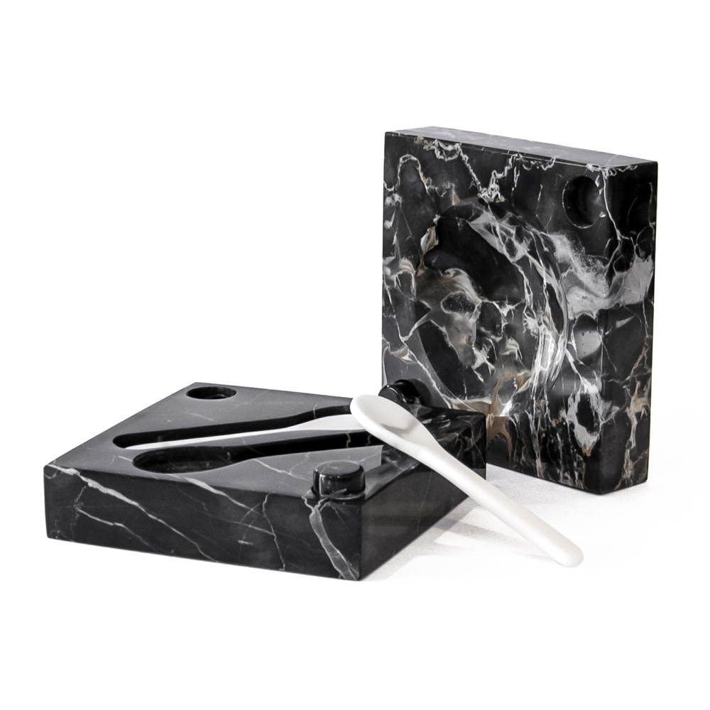 Stojan na kaviár z Portoro mramoru s bílými lžičkami Carrara, vyrobený v italském designu.