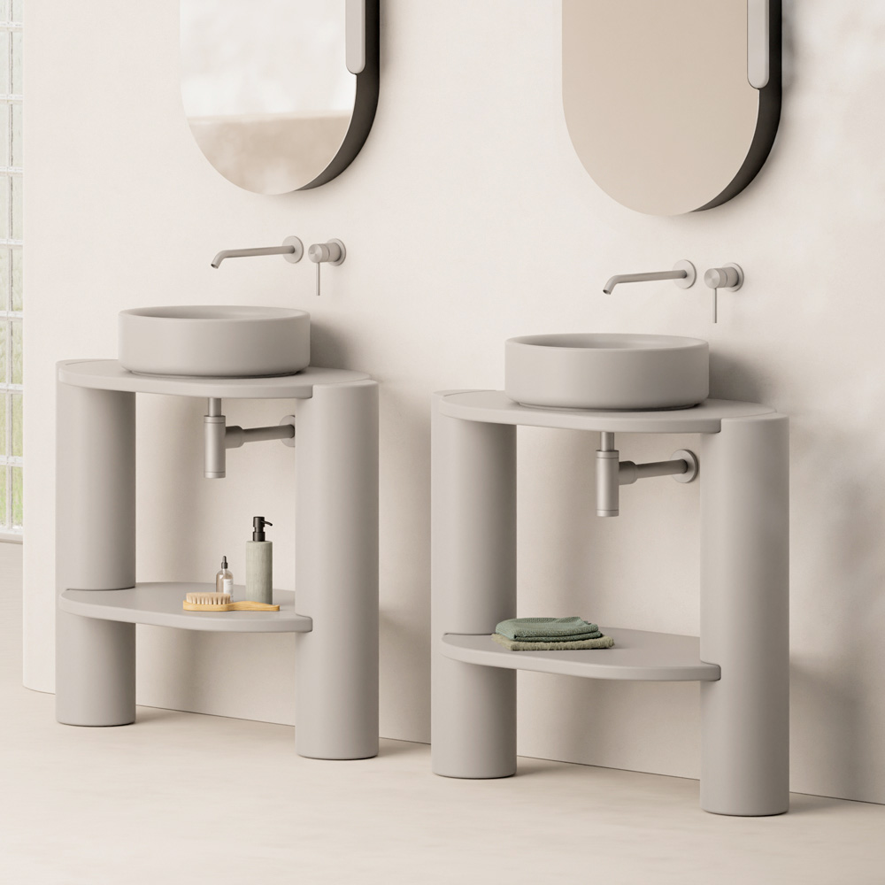 Tato keramická konstrukce vyniká svým originálním designem s válcovými sloupy a integrovanými policemi , které vytvářejí dokonalou rovnováhu mezi estetikou a funkčností.