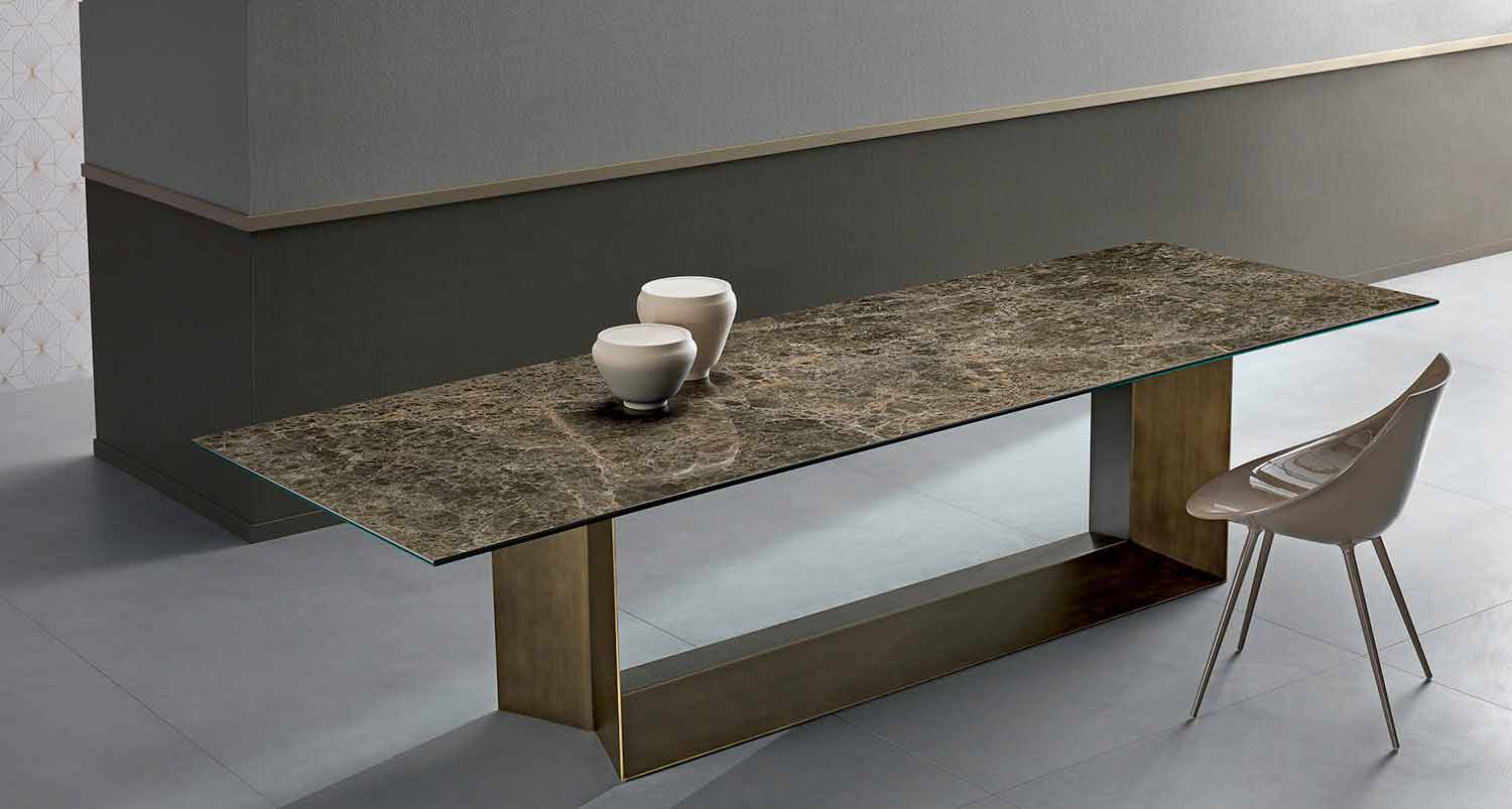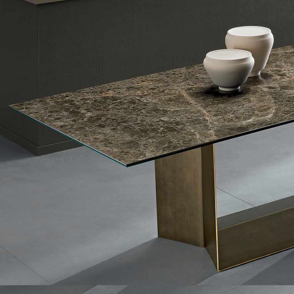 Luxusní kuchyňský stůl s leštěným keramickým topem Emperador a kartáčovanou bronzovou kovovou základnou, vyrobené v Itálii.
