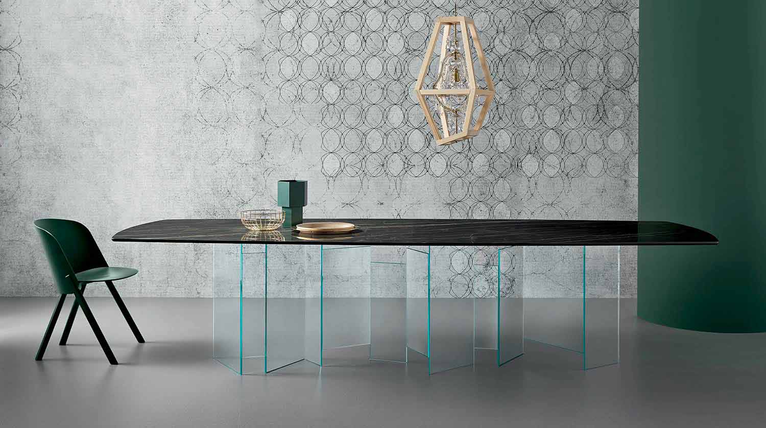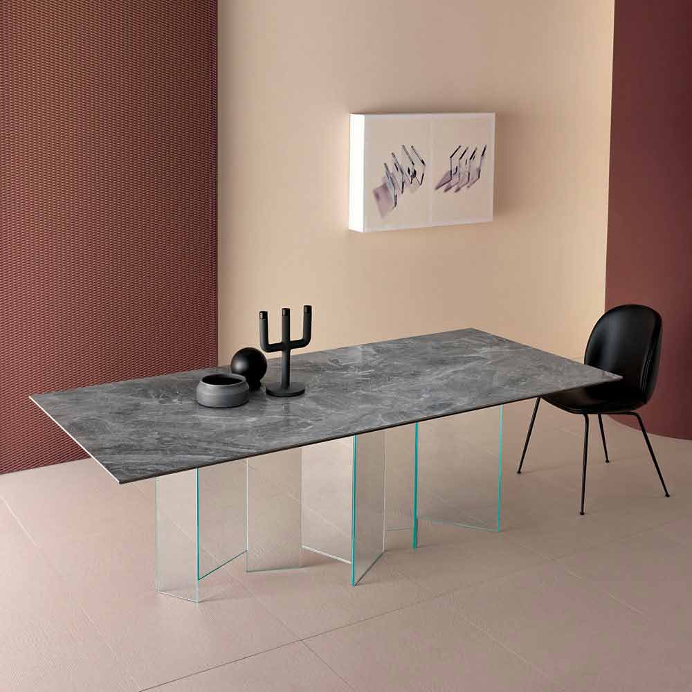 Moderní designový stůl s keramickou deskou a extra čirým skleněným podstavcem, vyrobený v Itálii.